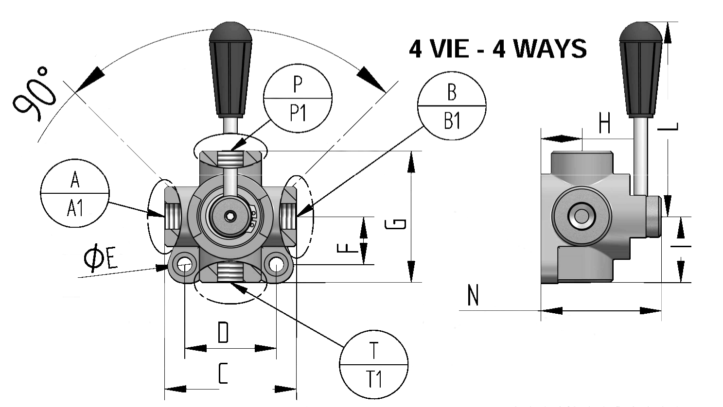 Produktinformationen "4/3-Wegeventil mechanisch umschaltbar, Mittelstellung geschlossen, für Rohrleitungseinbau"