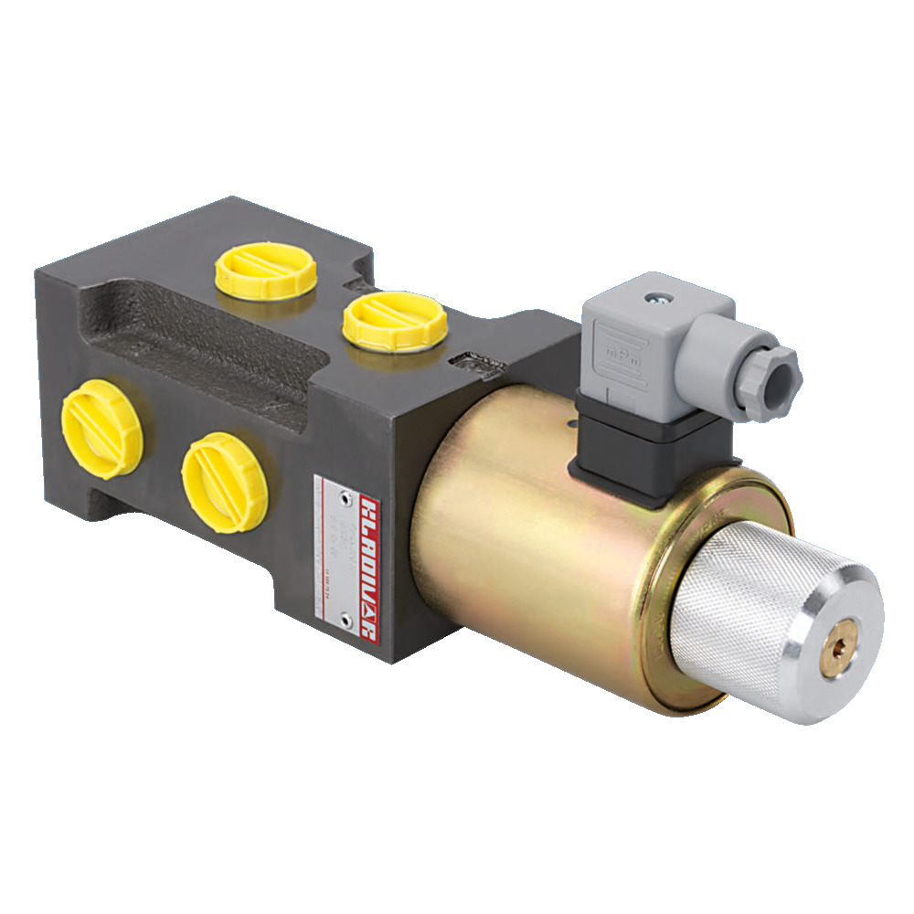 6/2-Wege-Umschaltventile eignen sich für Traktore und Schlepper, Anbaugeräte, Telelader, Bagger, Baggerlader, Radlader und viele weitere Maschinen. Umschaltventile dienen zum Umschalten einer Doppelfunktion durch elektrische Ansteuerung. Die Anwendung erfolgt zwischen einem Hydraulik-Steuerblock und zwei unterschiedlichen Hydraulikfunktionen bzw. hydraulischen Verbrauchern. Grundstellung stromlos - Durchgang von P1/P2 nach C/D. Geschaltete Stellung - Durchgang von P1/P2 nach A/B. 100 % Einschaltdauer. Mit Leckölanschluss R 1/4". Der angebebene Betriebsdruck bezieht sich auf einen Betrieb ohne angeschlossener Leckölleitung!