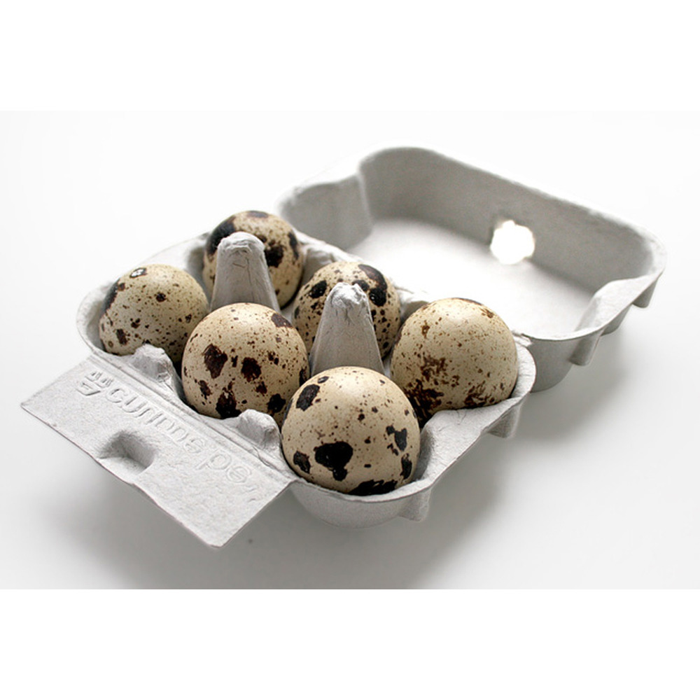Eierschachtel aus grauem Karton, in dem 6 Wachteleier gut und sicher verstaut werden können. Ideal für den Markt, Direktvermarktung oder einfach nur zum Lagern der empfindlichen Wachteleier.