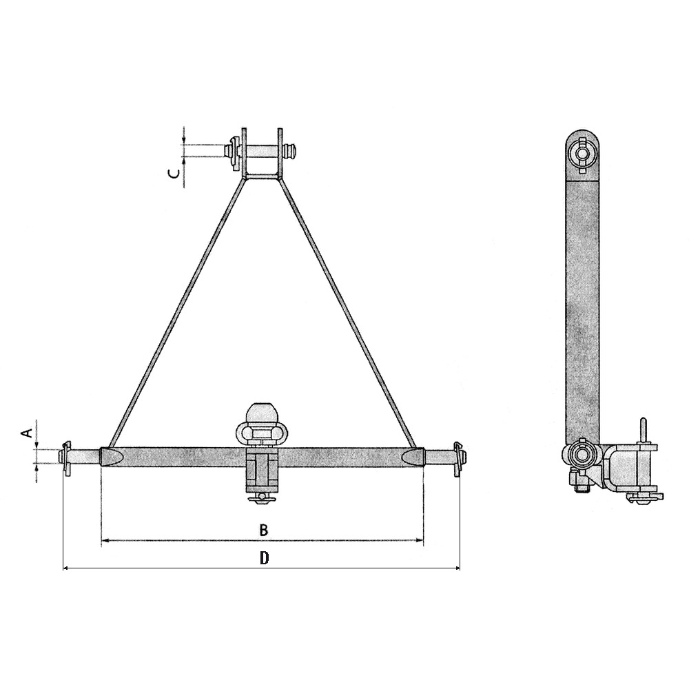 Mit Anhänger-Kugelbolzen 50 mm und Anhänger-Zugmaul, verdrehsicher, A: 22 mm, B: 661 mm, C: 19 mm, D: 775 mm (keine StvO Zulassung)Mit dem Ackerschienendreieck Kat 1 können Sie Anbaugeräte an Ihren Traktor/Schlepper anhängen. Das Dreieck hat sowohl einen Anhänger-Kugelbolzen K50 sowie ein Anhänger Zugmaul.Das Ackerschienendreieck ist verdrehsicher und beugt somit Unfälle vor. Es wird sowohl an den Unterlenkern, als auch am Oberlenker befestigt. Unterlenkerbolzen: 22 mm, Oberlenkerbolzen: 19 mmDas Ackerschienendreieck wird inkl. Bolzen und Klappstecker geliefert.