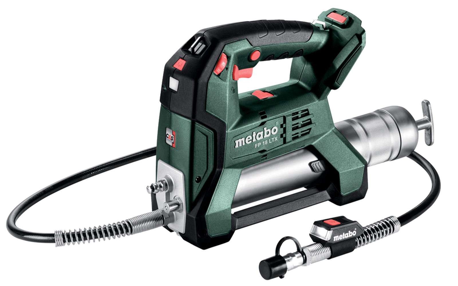 Profi Akku Fettpresse mit max. 690 bar, für Direktbefüllung, Gebinde oder 400g Standard-Fettkartuschen, LED-Licht für optimale Sicht, Fettmenge in 10 Stufen einstellbar. 1200 mm Schlauch und Nippel, ohne Akkupack ohne Ladegerät.