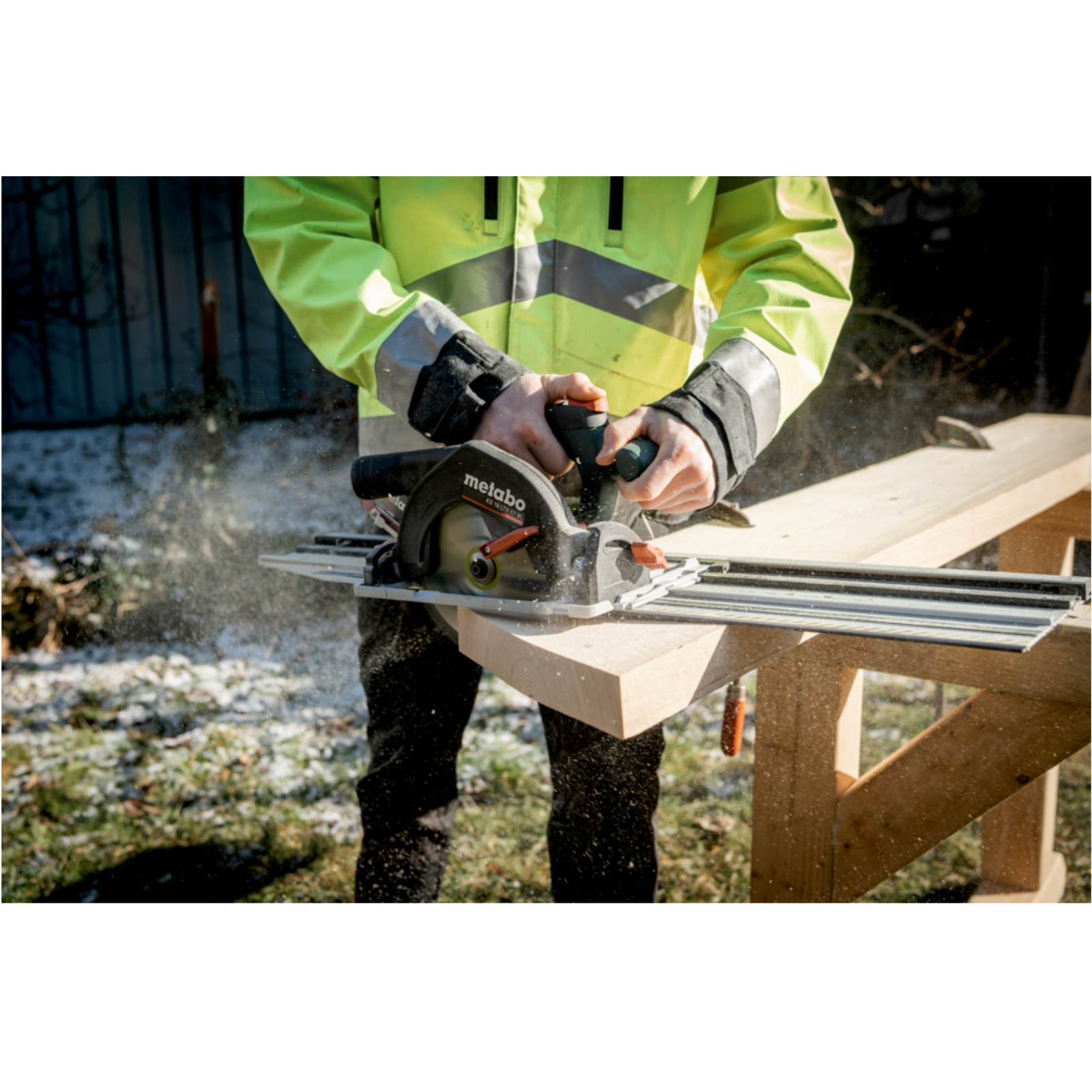 Winkelgenaue Schrägschnitte bis 50°, mit praktischem Rastpunkt bei 45°.Aluminium-Bodenplatte direkt einsetzbar auf Führungsschienen von Metabo sowie Mafell, Bosch, Festool, Makita, HiKOKI, Hilti und anderen Herstellern.
