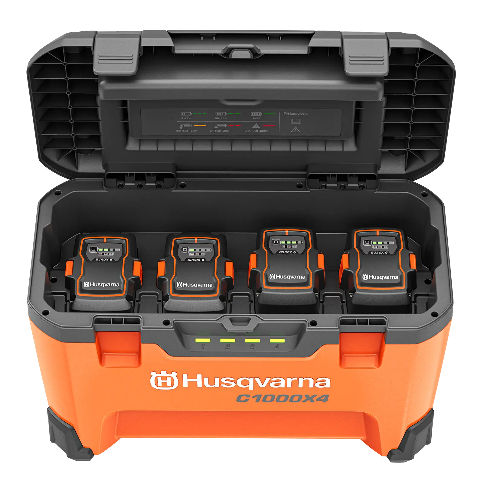 Mit der Husqvarna 40-C1000X4 Multi-Rack-Ladebox laden Sie Ihre BLi-X 36V Akkus dort, wo Sie sie brauchen – in der Werkstatt, unterwegs im Auto oder direkt auf der Baustelle. Bis zu vier Akkus lassen sich gleichzeitig und besonders schnell laden.