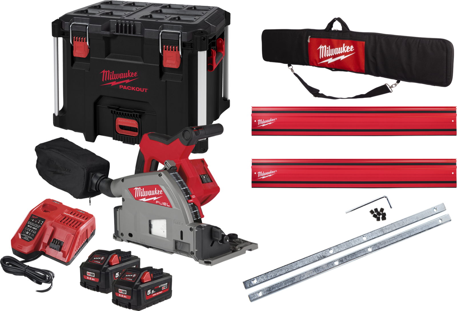 Aktions- Komplett Set inkl. Säge, 2 x Akku 18 V / 5,0Ah, Ladegerät, Koffer sowie 2 x Führungsanschlag 1400 inkl. Verbindungsstück und Transporttasche, sowie einer Schutzbrille und eine paar hochwertiger Arbeitshandschuhe.