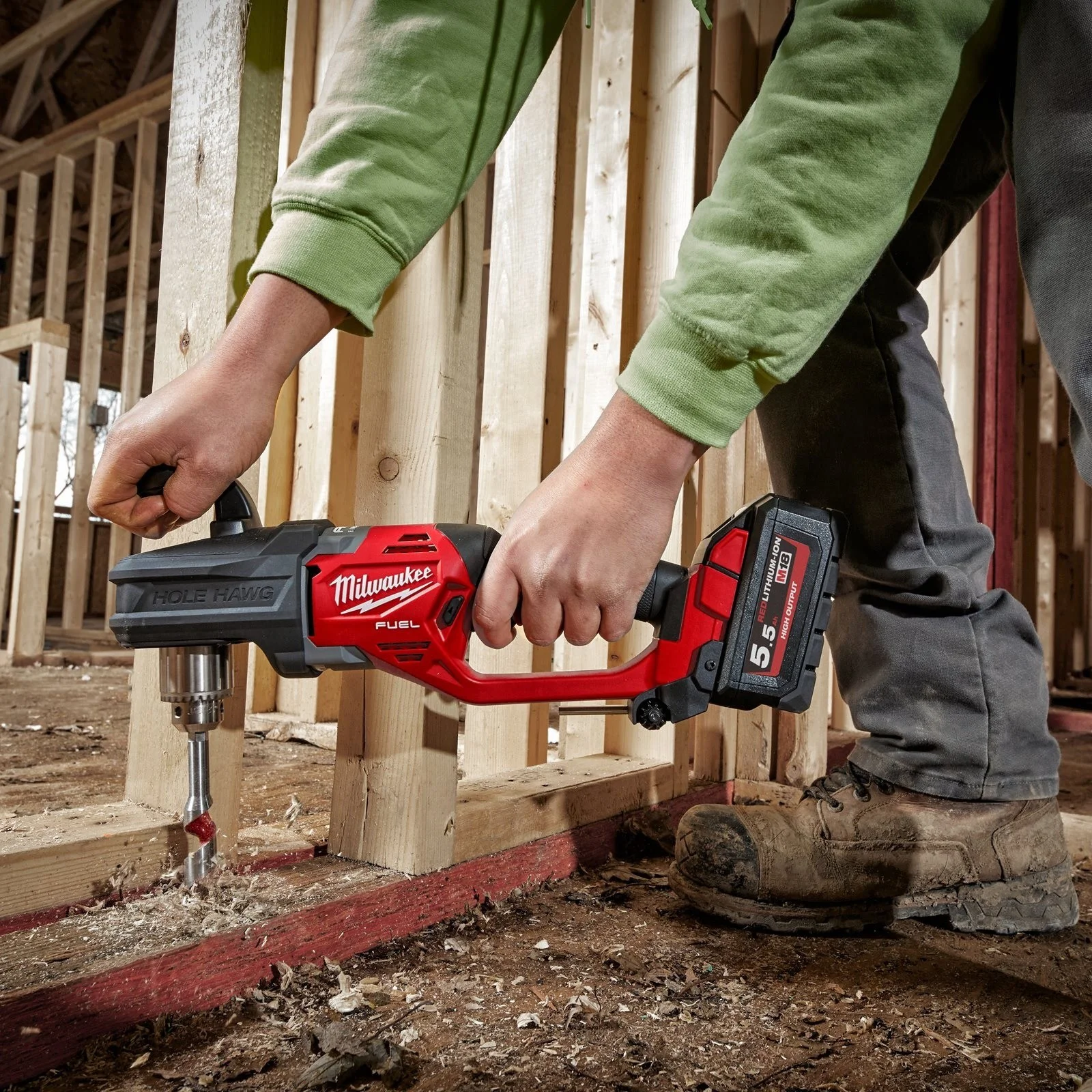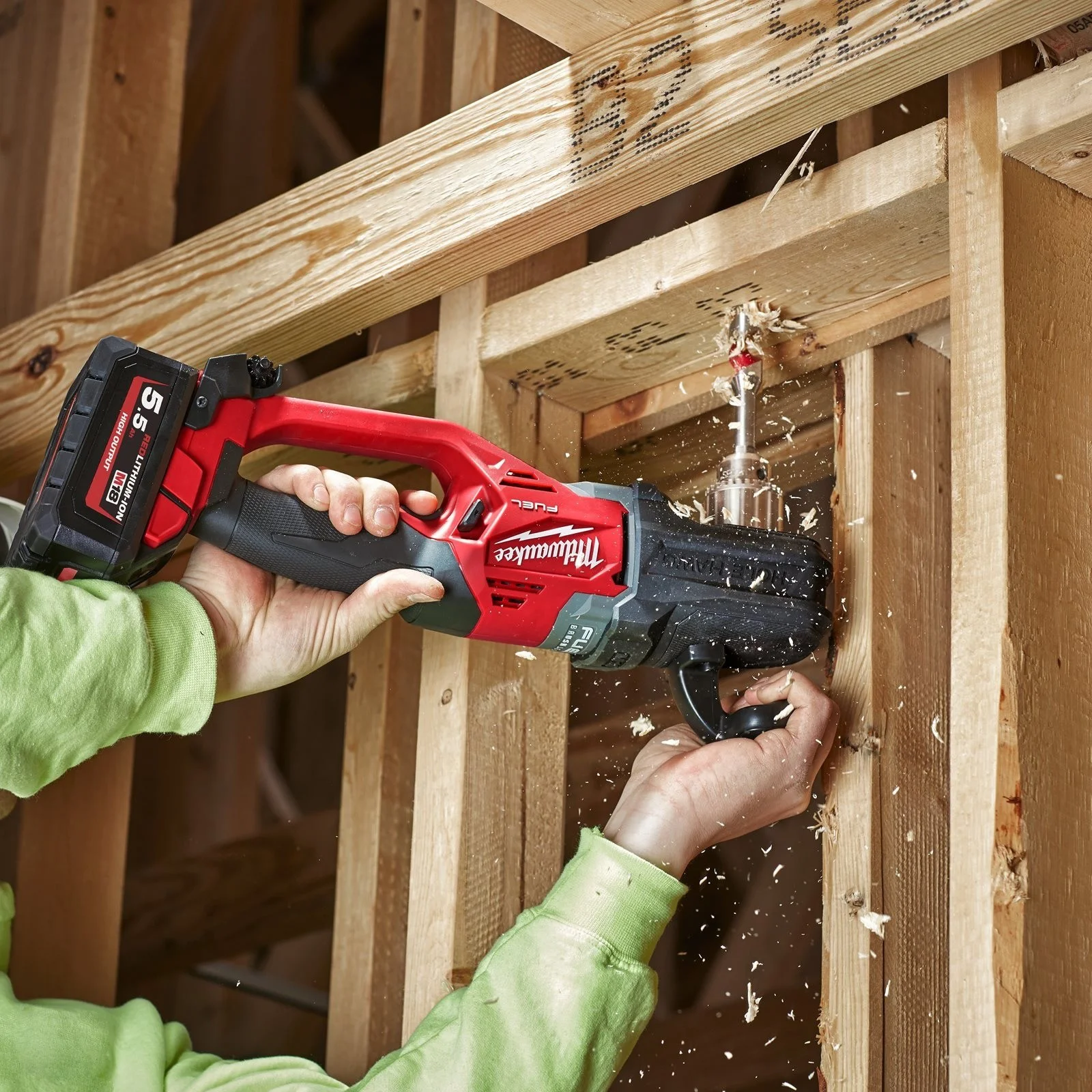 • Bis zu 200 Löcher in 50 x 100 mm Bauholz (22-mm-Schlangenbohrer) mit einer Akkuladung (5,5 Ah)