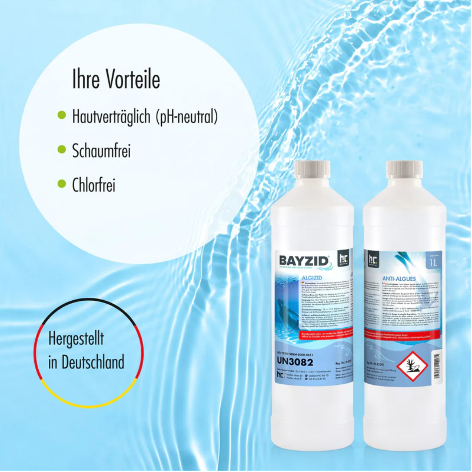 Zuverlässiger Schutz vor Algen, Bakterien und Pilzen, halten Sie Ihr Schwimmbecken frei von Algen, Bakterien und Pilzen mit diesem hochwertigen 1-Liter-AlgizidMit dem 1-Liter-Algizid von Höfer Chemie erhalten Sie ein hochwertiges Mittel zur effektiven Vorbeugung gegen Algenbildung in Ihrem Schwimmbecken. Das BAYZID® Algizid hemmt das Wachstum von einzelligen und mehrzelligen pflanzlichen Mikroorganismen, deren Ausbreitung durch Sonnenlicht, Phosphate, Staub, Regen und Wind begünstigt wird. Zusätzlich wirkt es gegen Bakterien und Pilze und sorgt so für dauerhaft klares, hygienisch sauberes Wasser.Dosierungshandhabung:Pro 10m³ Wasser je nach Wetterlage 70-140 ml Algizid Algenverhütung bei Erstbehandlung direkt in das Becken geben. Danach 25-50 ml wöchentlich.Bei Ersteinfüllung hat sich bewährt, die Wände und den Boden mit Algizid einzureiben und ca. 1 Std zu warten, bis der Pool befüllt wird.Gewissenhaft für das reine SchwimmvergnügenDer Verbreitung von Algen, Bakterien und Pilzen in Ihrem Schwimmbecken wird mit dem zuverlässigen 1 L Algizid ein Ende gesetzt.Bereits nach der ersten Anwendung merken Sie den Unterschied und kommen in den Genuss sauberen und reinen Wassers.Alles über 1 L Algizid Algenverhütung: