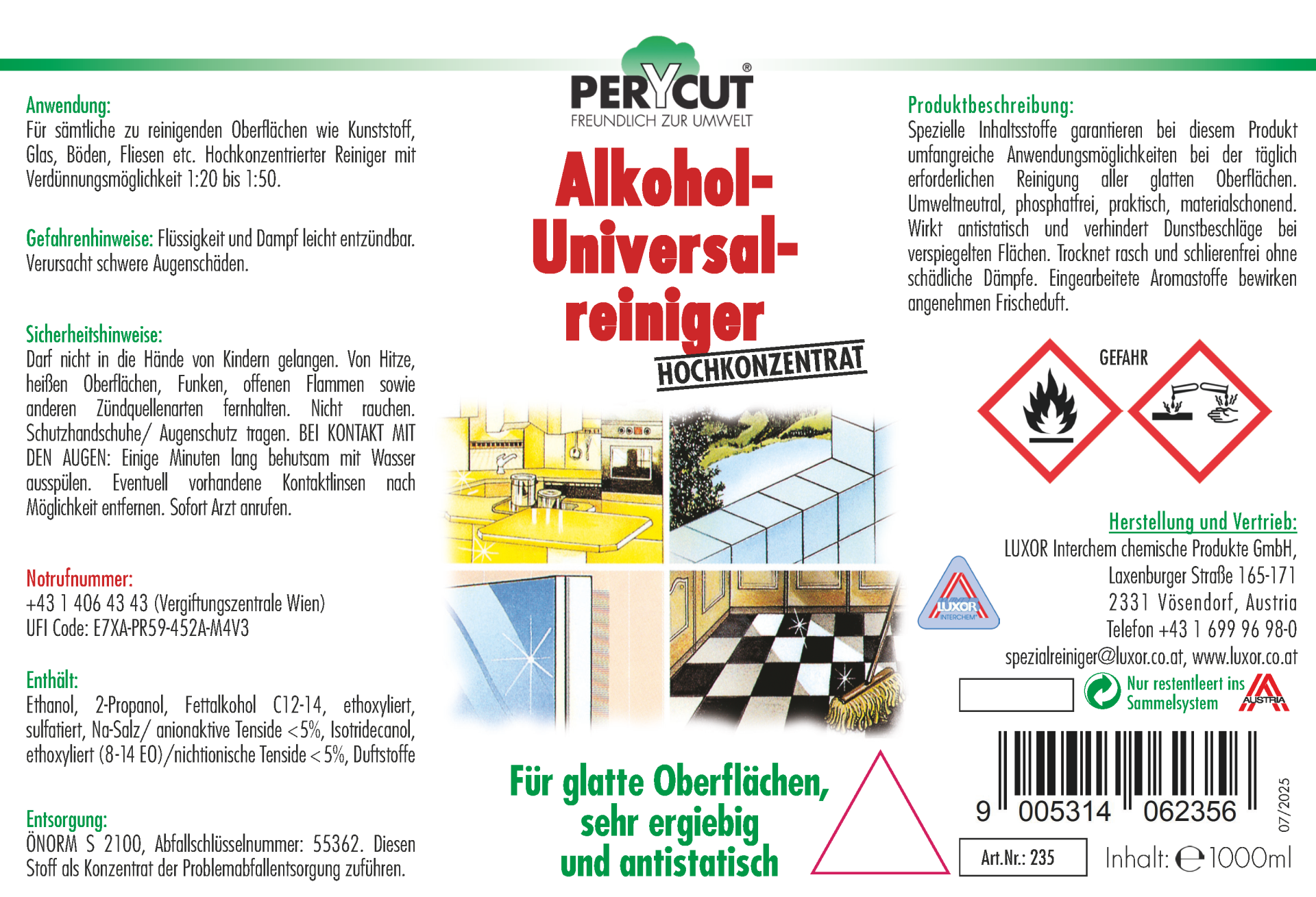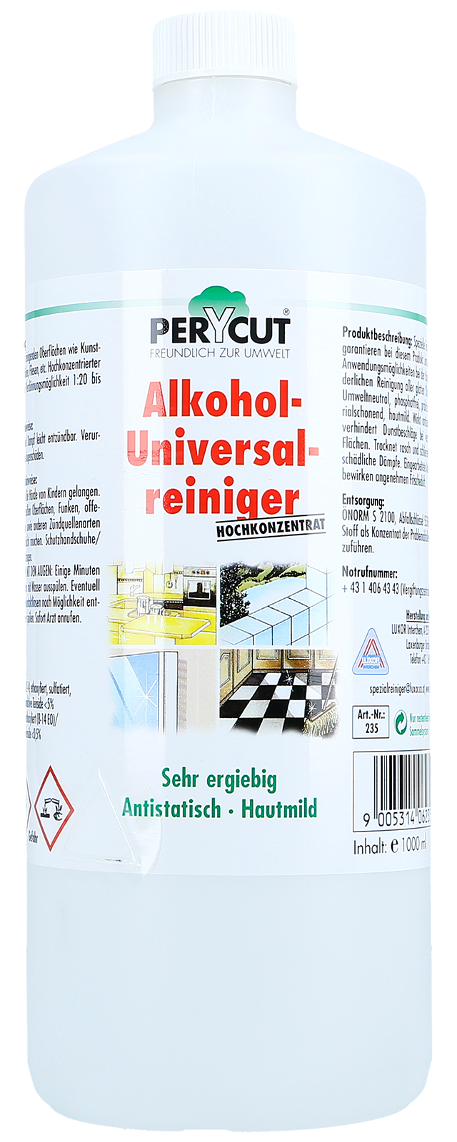 Alkohol-Universalreiniger 235 ist vielseitig einsetzbar und ideal für die tägliche Reinigung aller glatten Oberflächen.Dank spezieller Inhaltsstoffe entfernt er Schmutz, Fett und Rückstände gründlich und streifenfrei – ob im Haushalt, in der Küche, im Büro oder in der Werkstatt.