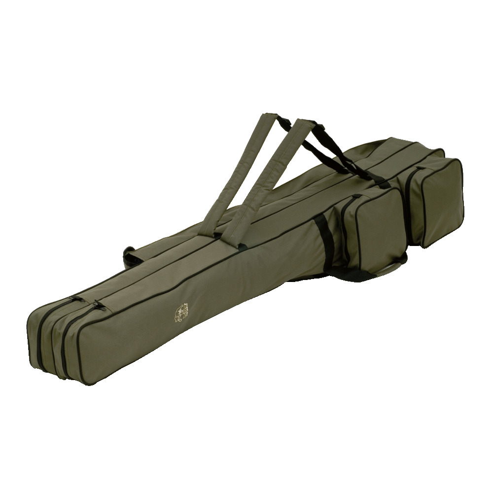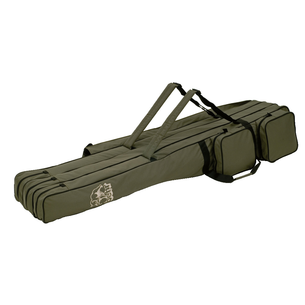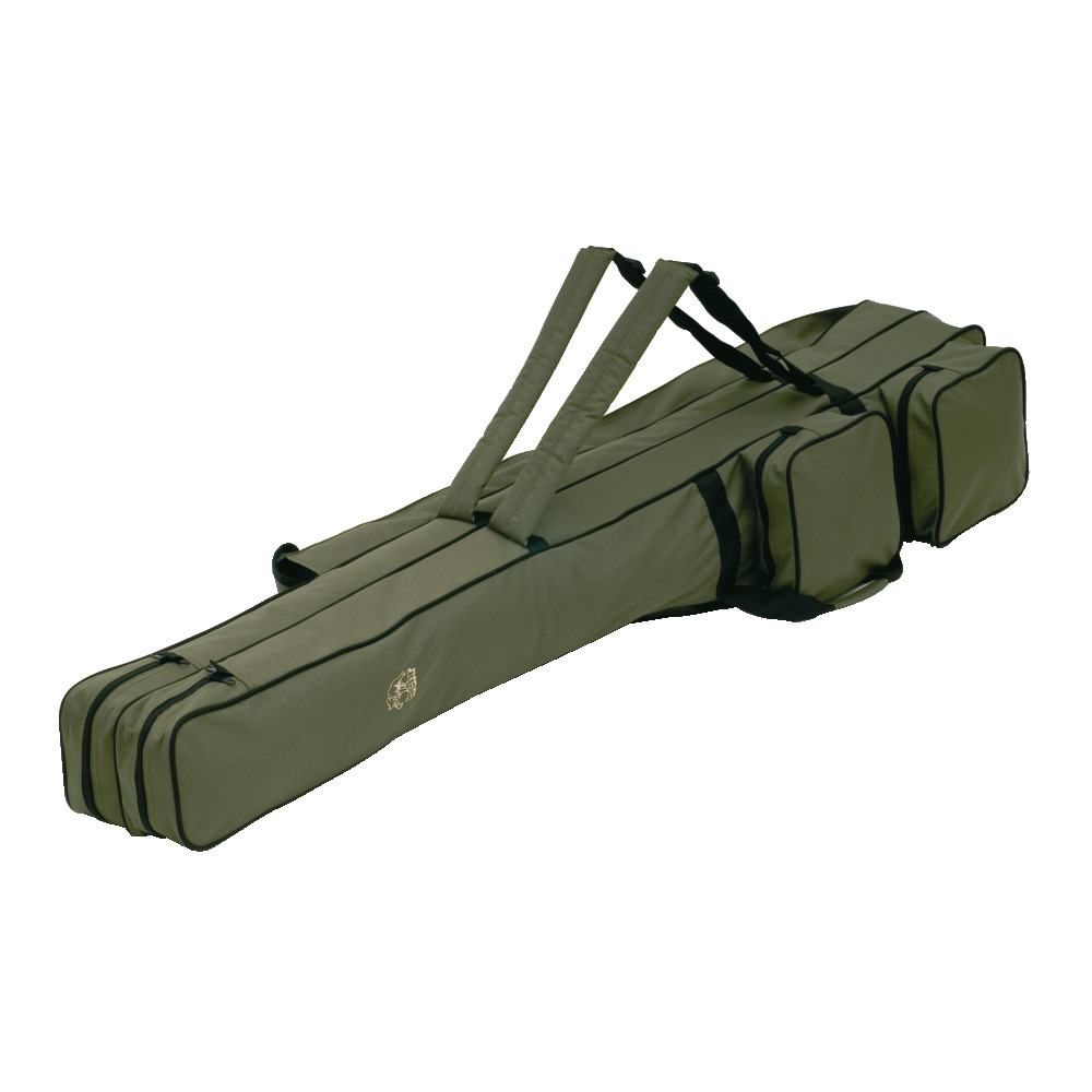 2 große ausgesetzte Außentaschen rechts, 2 kleinere Taschen links. Robuster und gut gespolsteter Rückentragegurt, sowie zusätzliche Handtragegurte, lange Seitenaußentasche für Erdspieße, Kescher usw.