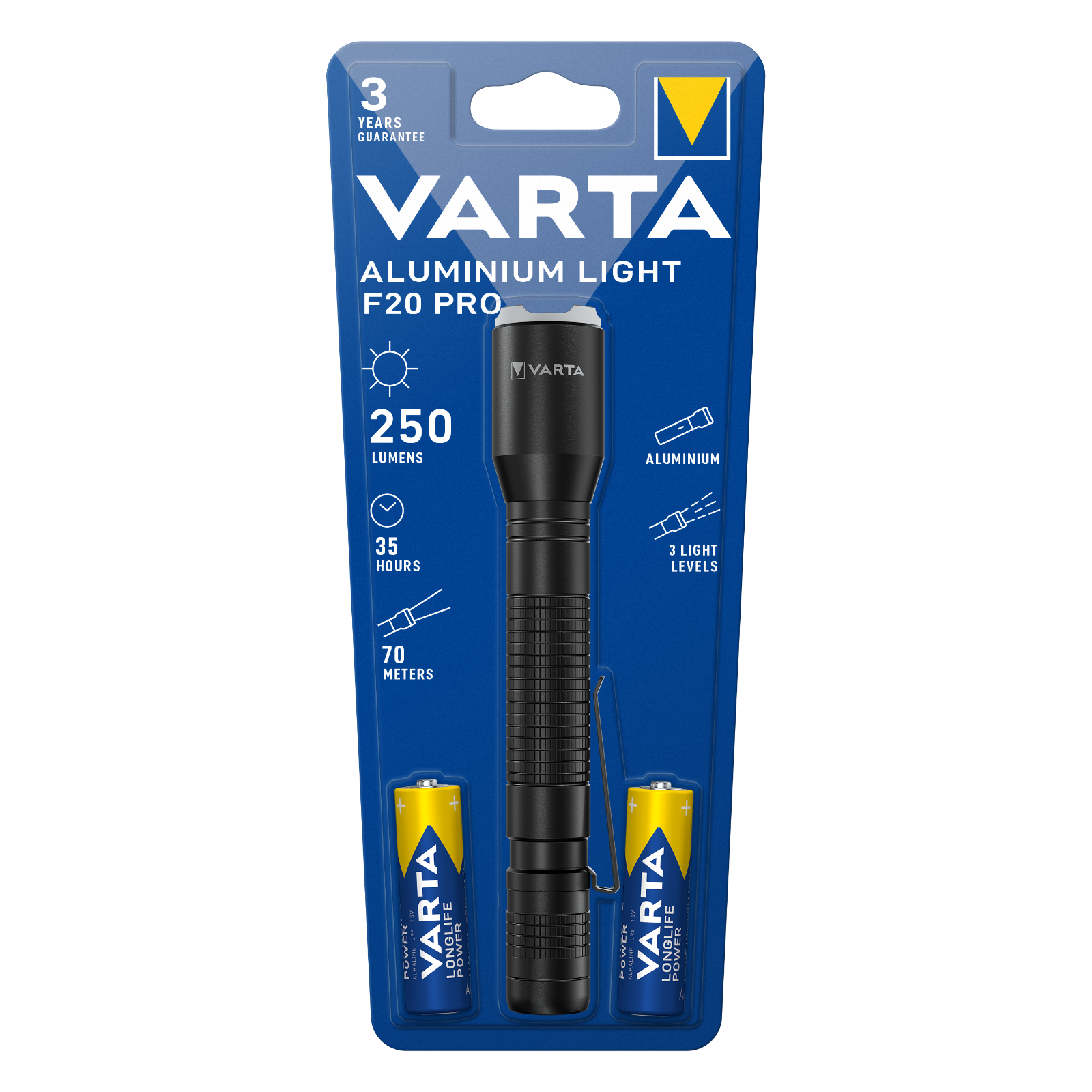 Elegante Taschenlampe mitschwarz eloxiertemAluminiumgehäuse und silbernen Ring mit matter Oberfläche und 3Leuchtmodi, hoher Lichtleistungund langen Laufzeiten,strukturierter Gehäuseoberfläche für maximalen Grip. Die VARTA Aluminium Light F20 Pro verfügt über einen Spot to Flood Mechanismus für präzisen Fokus oder einen weiten Winkel.3 Jahre VARTA Garantie