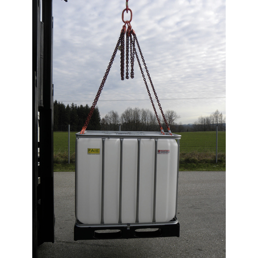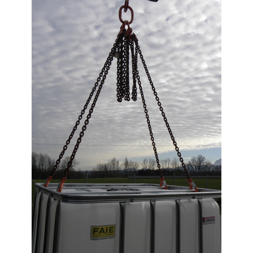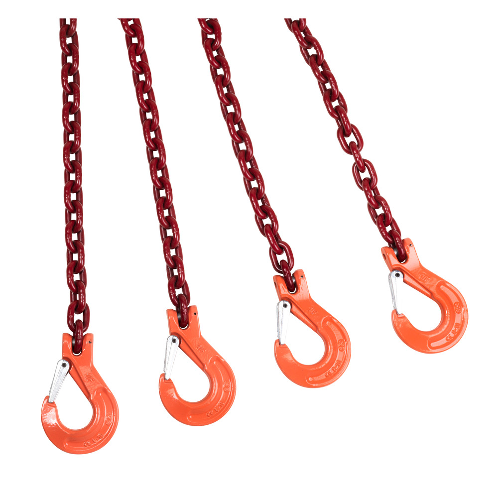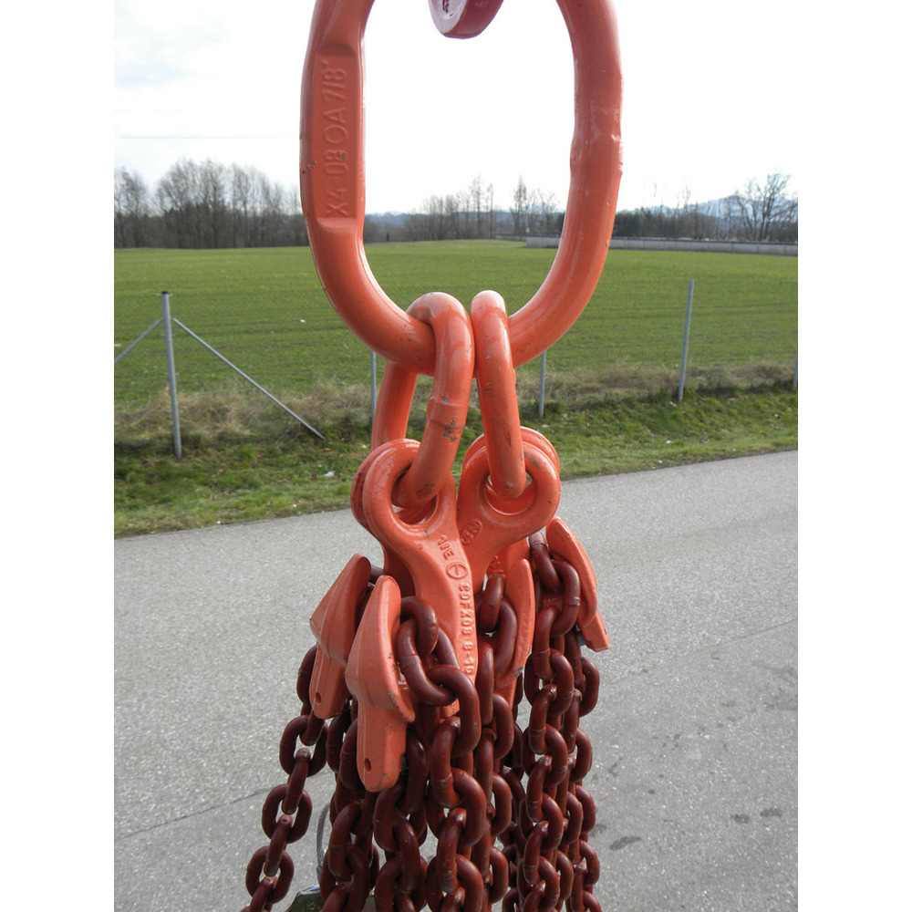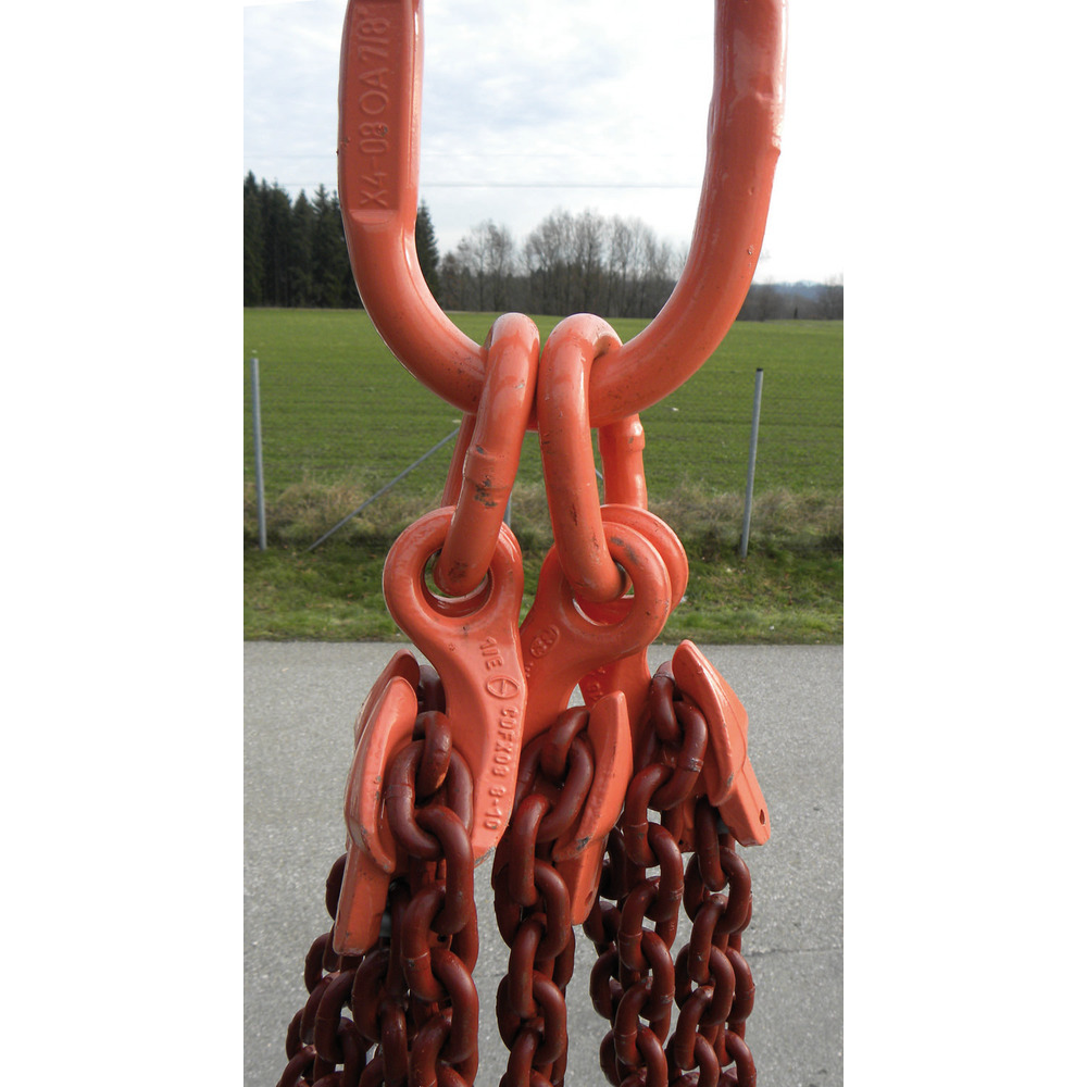 G 10, 8 mm, 3 Meter Nutzlänge mit vier Verkürzungshaken, Ring und Lasthaken, mit Prüfplakette, PAS-Kette (mit H-Stempel) nach EN 818-4, Tragfähigkeit: bei 45° - 5300 kg, bei 60° - 3750 kg.