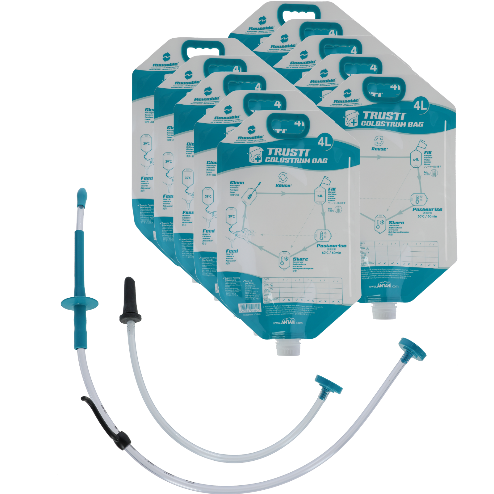 Zur einfachen Kolostrumgabe beim neugeborenen Kalb.Dieses Starterset besteht aus 10 wieder verwendbaren Kolostrumbeuteln a´4 Liter, 1 Sauger mti Schlauch und 1 Drenchsonde.
