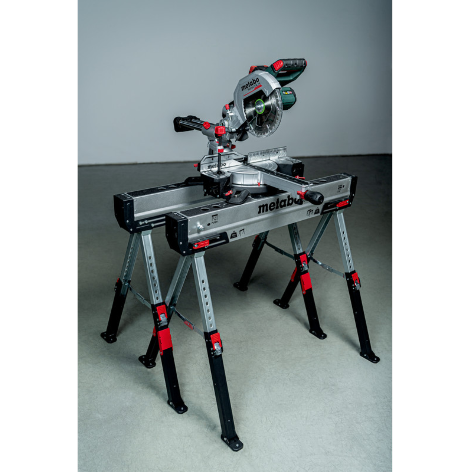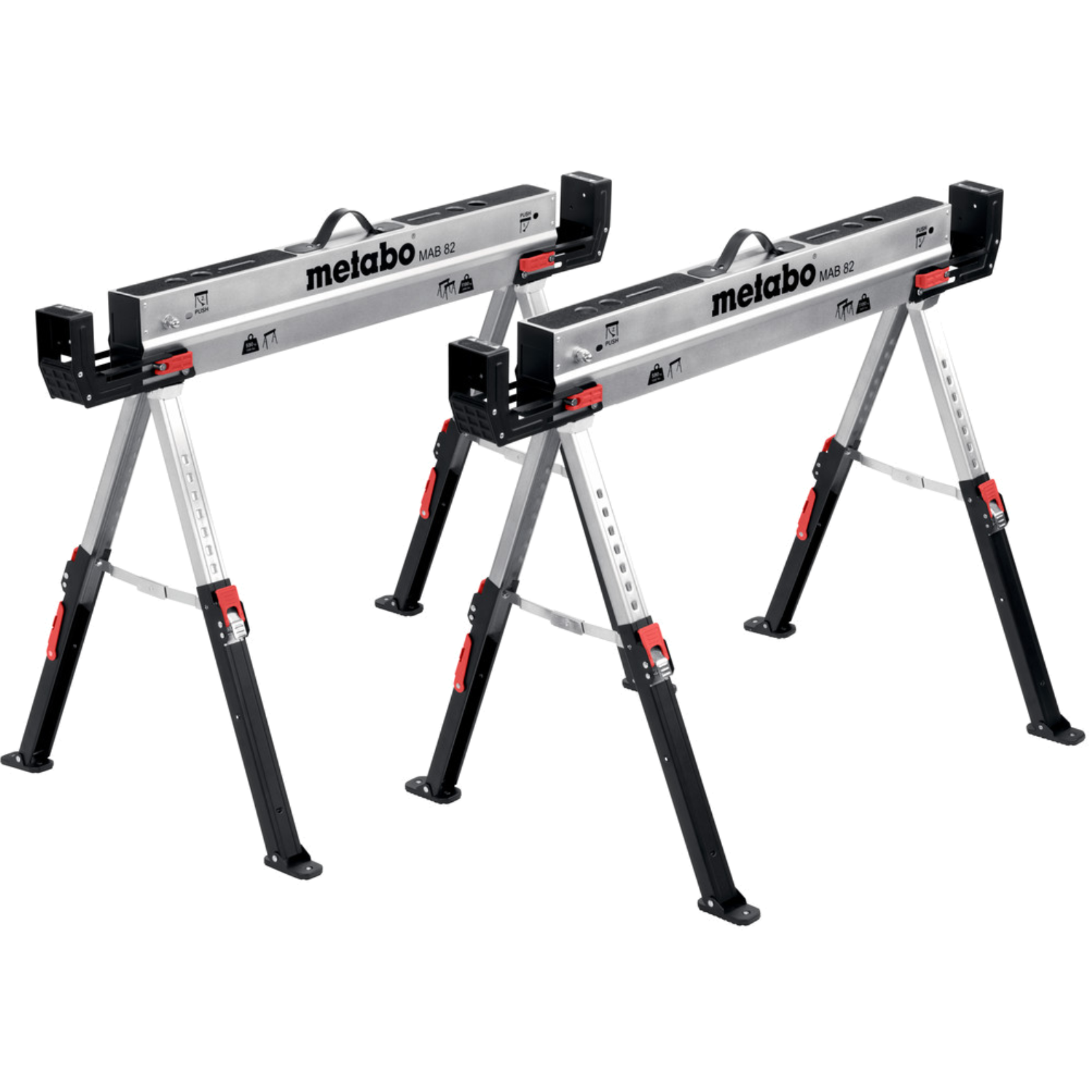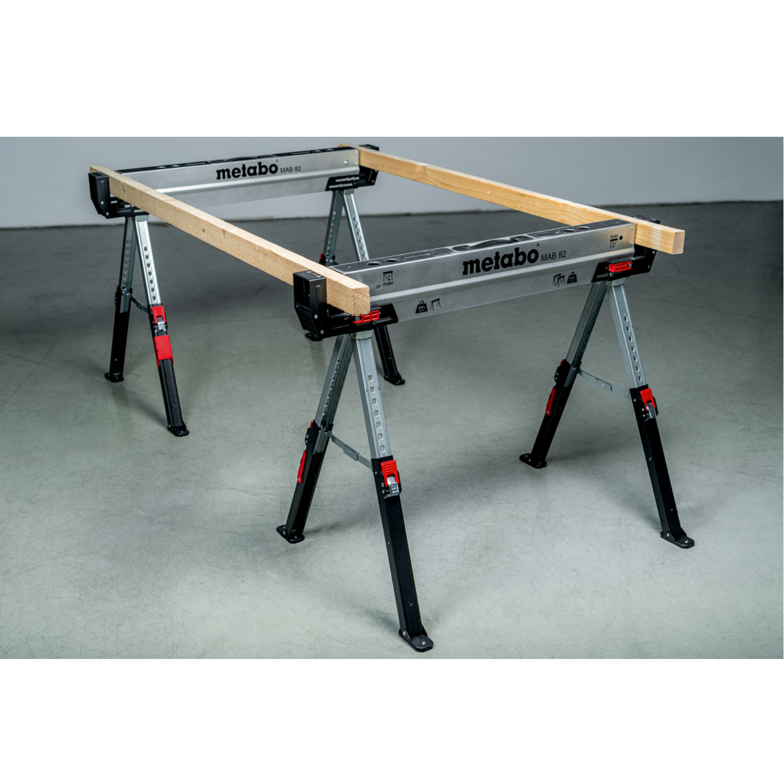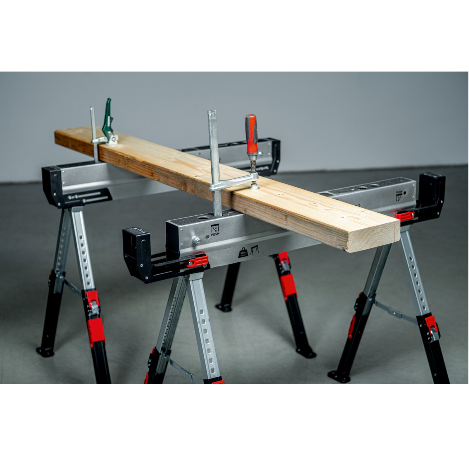 - Verstellbare, seitliche Kantholzstützen zum Verbinden zweier Böcke miteinander