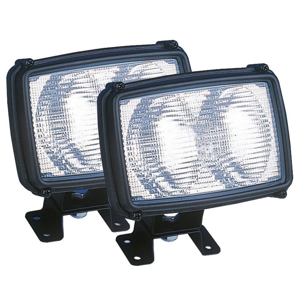 Robuster Arbeitsscheinwerfer mit Doppelreflektor, H3, 2x12 V/55 W, schlagfestes Kunststoffgehäuse, Glasstreuscheibe, Befestigung mit Omega-Bügel, inklusive H3 Glühlampen. BxHxT: 160x145x125 mm.