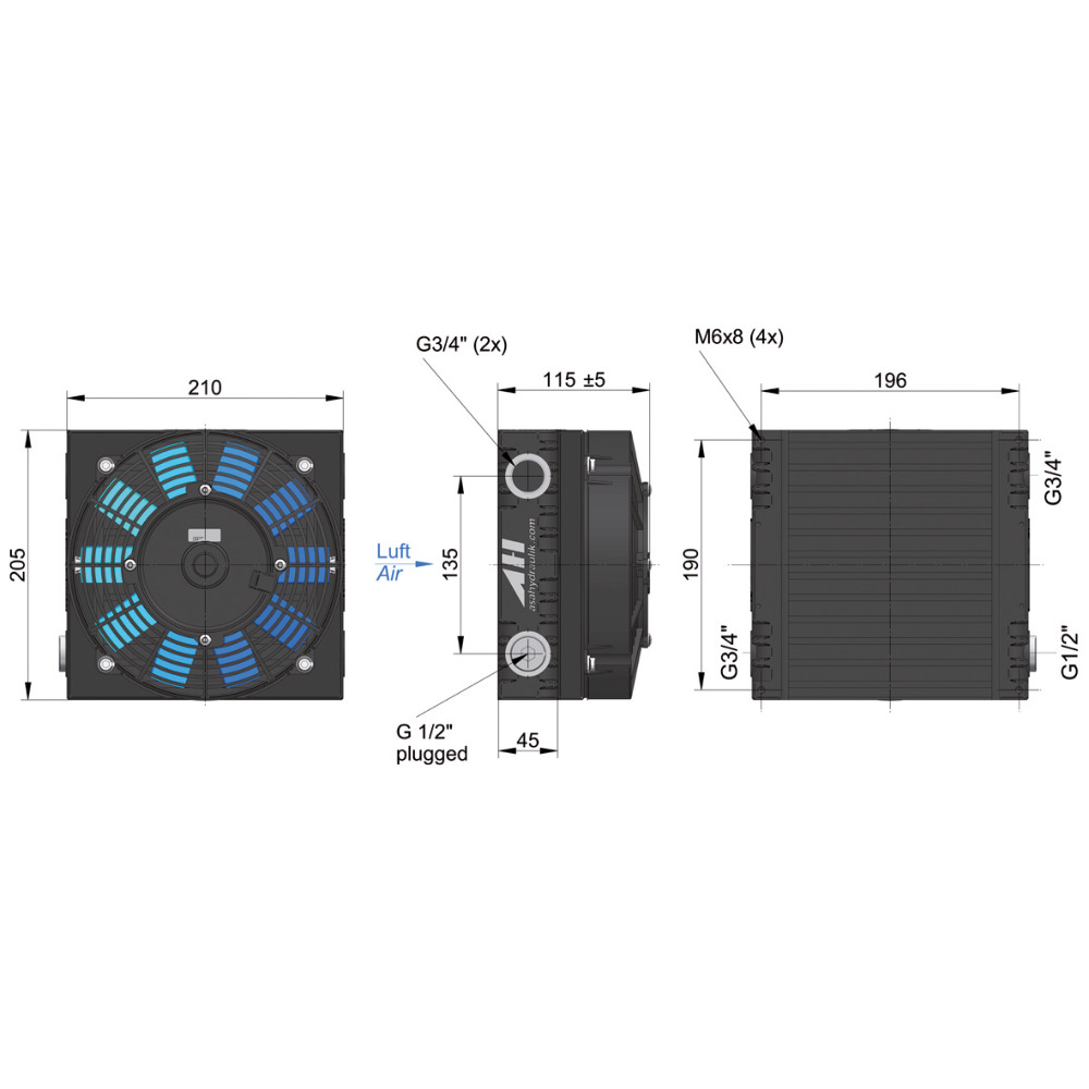 Aluminium-Ölluftkühler in Plattenbauweise. Maximaler Betriebsdruck 26 bar, Schutzart IP68.Ölkühler werden bei Dauerbetrieb von hydraulischen Anlagen zur Abkühlung des Hydrauliköls eingesetzt. Vorwiegend werden Ölkühler jedoch auf solchen Anlagen montiert, die nachträglich mit weiteren hydraulischen Verbrauchern ausgerüstet wurden. Bei diesen Umbauarbeiten wird in vielen Fällen der Tankinhalt nicht vergrößert und dadurch erhöht sich der Umlauf und die Temperatur des Öles im Hydrauliksystem. Die optimale Betriebstemperatur einer Hydraulikanlage liegt zwischen 50-60°C. Erhöht sich die Temperatur zu stark, muss die überschüssige Wämemenge über einen ÖL/Luftkühler abgeführt werden.Um die Größe des Ölkühlers festlegen zu können, benötigen wir für die Berechnung einige Daten von Ihnen:- Zahnradpumpe oder Regelpumpe- Fördermenge der Pumpe in L/min- Tankinhalt in L (wenn bekannt)- Öldruck im Hydrauliksystem in bar- Umgebungstemperatur in °C- Öltemperatur der Hydraulikanlage in °C- Anschlussspannung in VWir berechnen gerne für Sie den benötigten Ölkühler und freuen uns auf Ihre Anfrage.