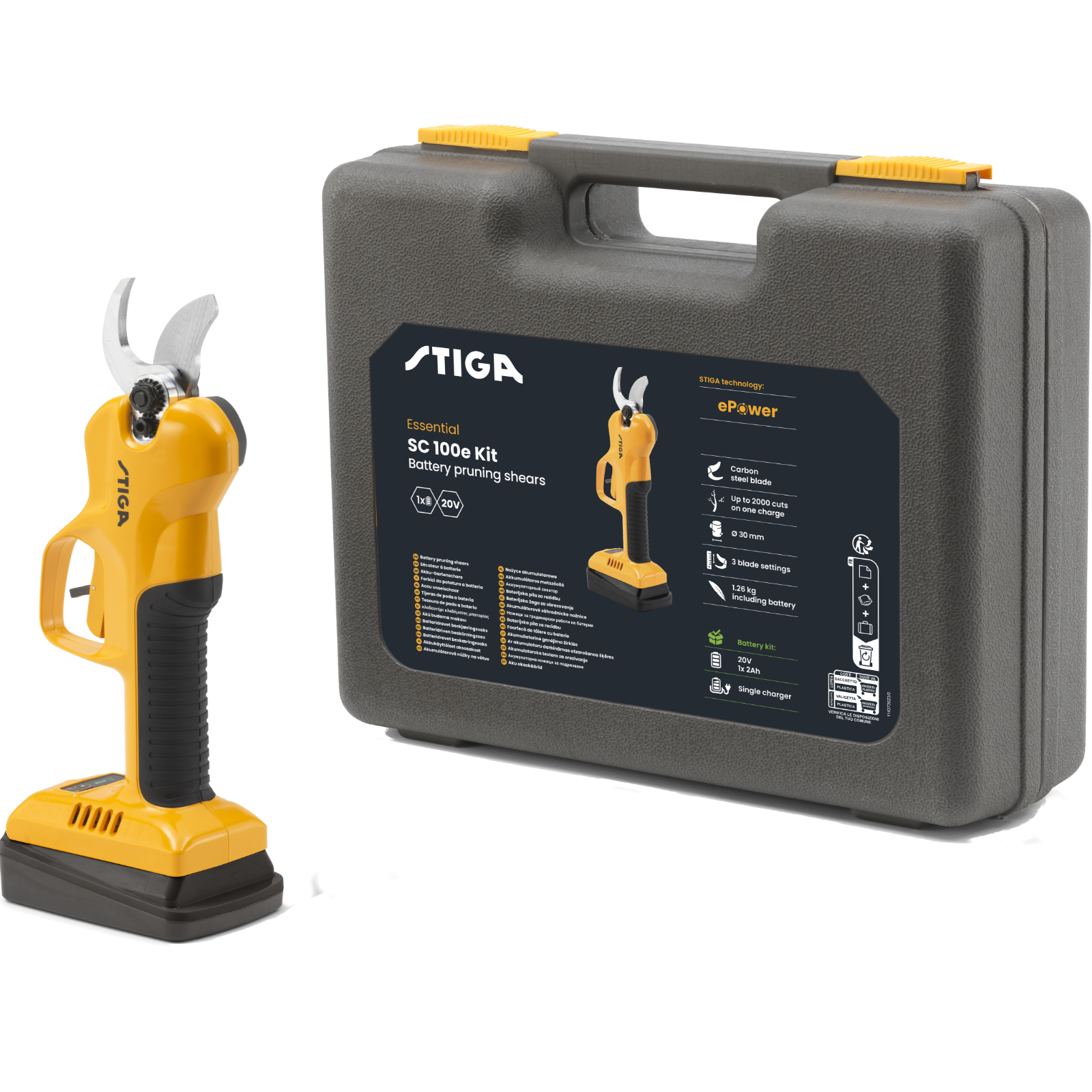Ohne Kraftanstrengung zum Schneiden von Sträuchern, Blumenbeeten,Hecken und kleinen ObstbäumenDie STIGA SC 100e Kit-Schere ist die perfekte Lösung, um alles, was bis zu einem Astdurchmesser von 2,8 cm wächst, auf einfache und sichere Weise zu schneiden.Sie ist ergonomisch gestaltet und verfügt über einen für zwei Finger ausgelegten Auslöser mit einfachem Sperrsystem, das einen automatischen Schnitt ausführt.Eine Stand-by-Software-Sperre gewährleistet maximale Sicherheit für Sie und andere Personen im Garten.Dank ihrer ausgezeichneten Balance und ihres geringen Gewichts werden Ihre Muskeln nicht ermüden.Man kann die SC 100e digital auf drei Messeröffnungen für unterschiedliche Astdurchmesser einstellen - 15, 25 und 30 mm.Ausgestattet mit einem STIGA ePower 20V 2Ah-Akku - aber auch kompatibel mit 4 Ah - sorgt er für eine angemessene Laufzeit und ein intelligentes Energiemanagement,das den Energiebedarf genau so anpasst, wie er für die Arbeit benötigt wird.