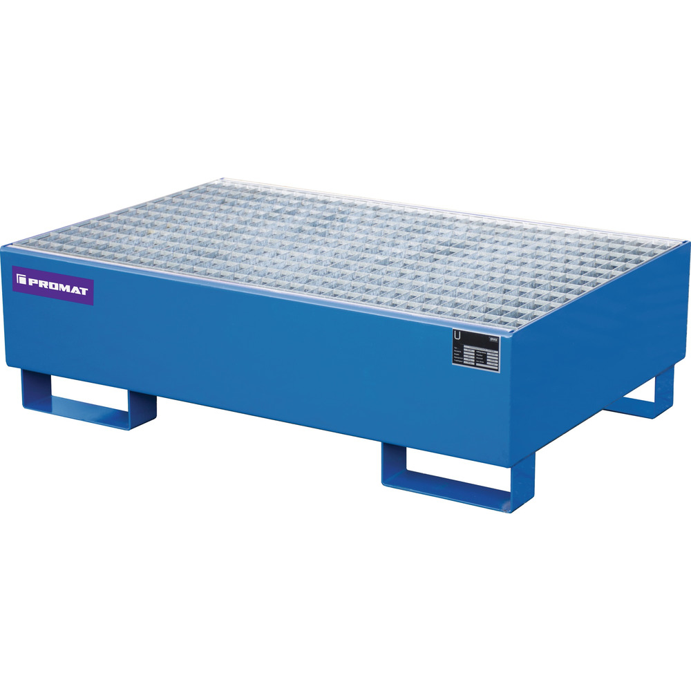 zur Lagerung von 200-L-Fässern oder Kleingebinde· nach Übereinstimmungserklärung (ÜHP) gemäß StawaR, zugelassen für entzündbare Flüssigkeiten der GHS-Kategorien 1-3, gewässergefährdende Flüssigkeiten der GHS-Kategorien 1-4 · robuste 3-mm-Stahlblech-Konstruktion · mit verzinktem Gitterrost · mit Füßen (der Gabelhubwagen muss die Wanne zwischen den Füßen heben) · Tragfähigkeit 1000 kg/m² · Aufwendig verarbeitete Z-Kantung für optimalen Halt des Gitterrostes ·Weitere technische EigenschaftenTragfähigkeit: 1000 kg/m² · Gewicht: 70 kg · Farbe: enzianblau, RAL 5010