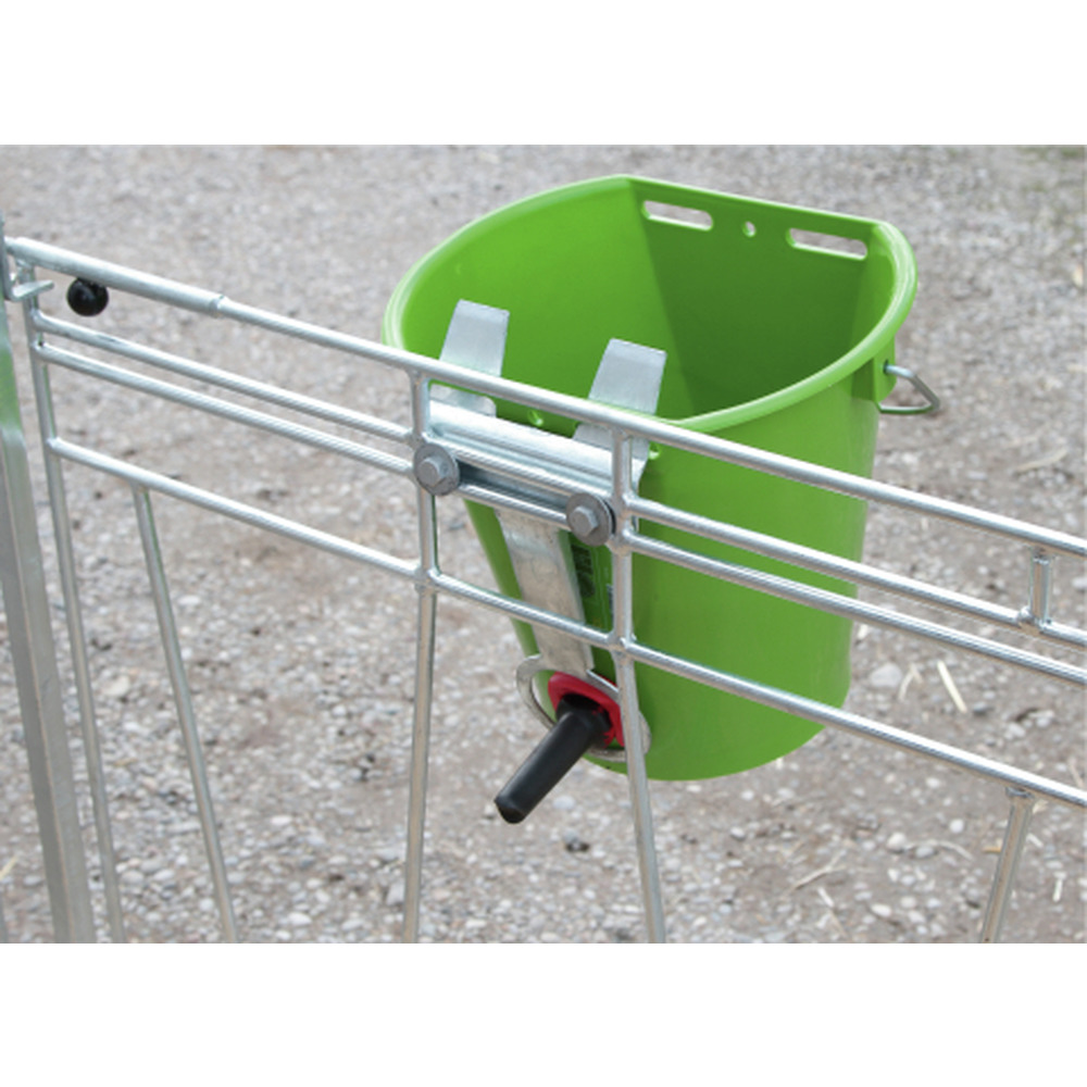 Geeignet für alle Tränkeeimer. Durch die Eimersicherung bleibt der Tränkeeimer beim Saufen in Position und kann nicht nach hinten weggestoßen werden. Geeignet zur Montage an Kälberhüttenzäunen. Verzinkt.