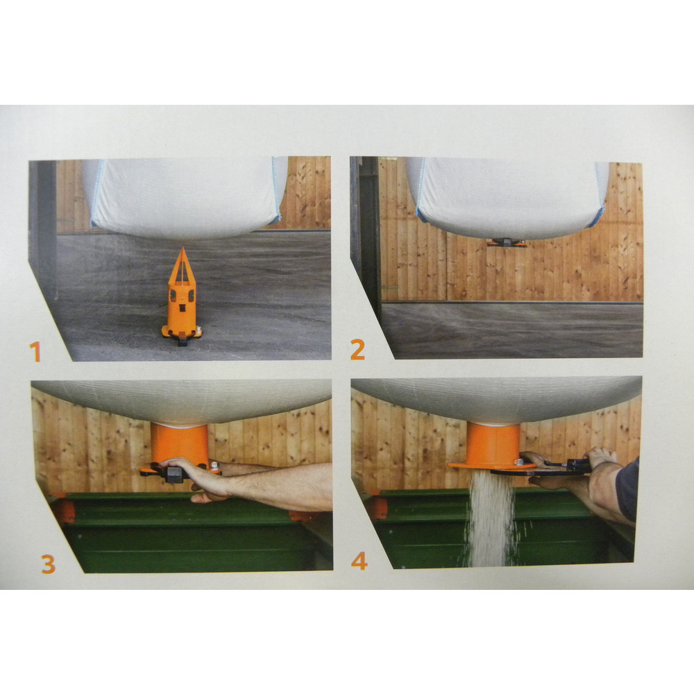 Innovativ, einfach, schnell und präzise entleeren!Geeignet für Futtermittel, Dünger, Saatgut, Pellets, Salz, Kies und Granulat, ...Und so einfach geht's:1) FLEDBAG auf festen Boden stellen. Den Big Bag anheben, und mittig über dem FLEDBAG positionieren.2) Den Big Bag absenken, so dass der FLEDBAG in den Big Bag eindringt, danach wieder anheben.3) Den FLEDBAG etwas nach unten ziehen.4) Einfaches dosieren durch Öffnen und Schließen des Schiebers.Vorteile: •Verstärkte Keilspitze:Leichteres Eindringen ins Big Bag-GewebeStandsicher und stabil: Polyamid-Glasfasermischung für höchste Belastbarkeiten und unbegrenzte Einsatzdauer.•Dichtheit:Big Bag Gewebe dichtet zuverlässig und dauerhaft ab. Vario-Schieber mit hoher Dichtheit.