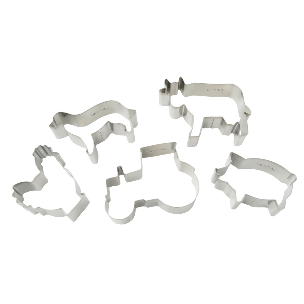 Tolles Ausstecher-Set Bauernhof 5tlg., aus Edelstahl, versch. Größen, spülmaschinengeeignet, Motive: Kuh, Hund, Henne, Traktor, Schwein, silber. Maße ca. 99x57,1x25mm