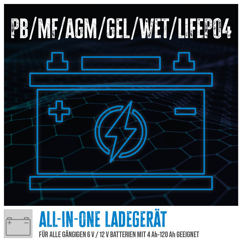 Für alle gängigen Batterien wie PB, GEL; AGM; WET und LiFePO4.