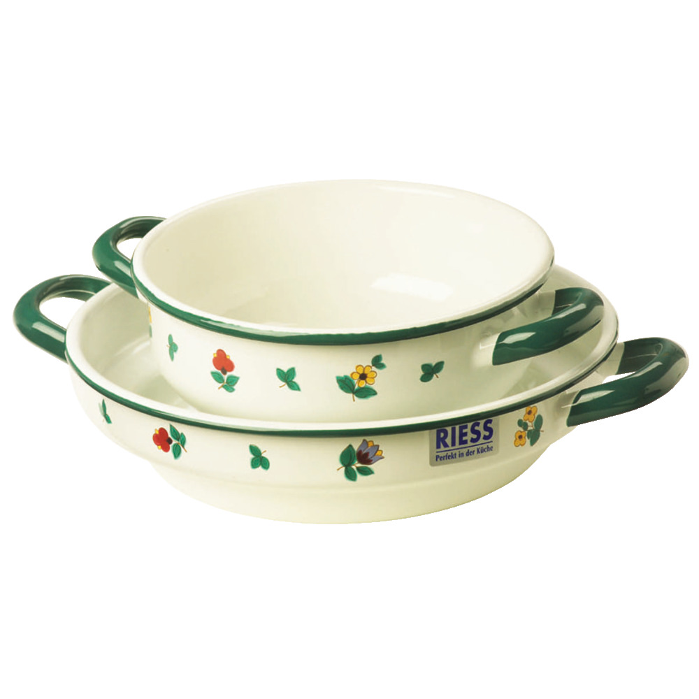Die Bauernschüsseln aus Emaille mit zwei Haltegriffen sind ein bunter Blickfang in der Küche und erhalten den Geschmack der Speisen. Der Werkstoff Emaille besteht aus Eisen, das bei hohen Temperaturen mit Glas verschmolzen wurde, also aus natürlichen Rohstoffen.