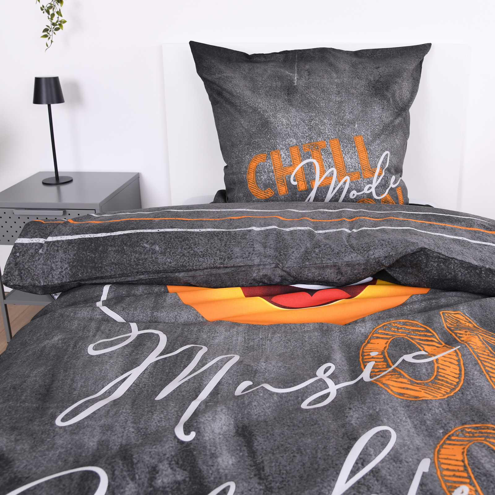 Mit dieser Bettwäsche ziehen gute Laune und Musik-Feeling ins Schlafzimmer ein. Das coole Smiley-Design mit Kopfhörern macht sie zu einem Highlight für Kinder, Jugendliche und Erwachsene. Das Set besteht aus 1 Bettbezug und 1 Kissenbezug, gefertigt aus 100 % Baumwolle. Das Material ist atmungsaktiv, hautfreundlich und nach STANDARD 100 by OEKO-TEX® zertifiziert.