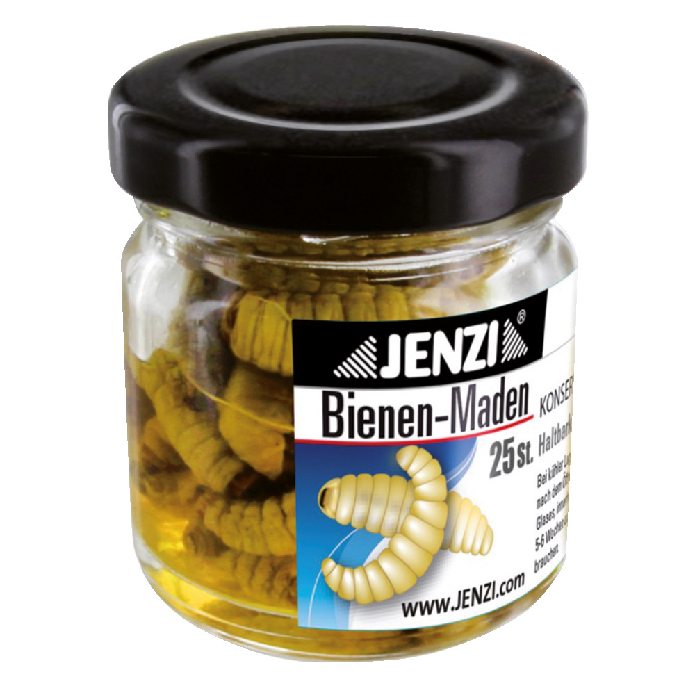 Bienenmaden. Natürliches Aussehen und Konsistenz durch spezielle Konservierung. Genau so fängig wie lebende Bienenmaden! Lieferumfang im vakuum-verschlossenen Glas. Inhalt: 25 Stück. Ungeöffnet mind. 2 Jahre haltbar, geöffnet ca. 6-8 Wochen.
