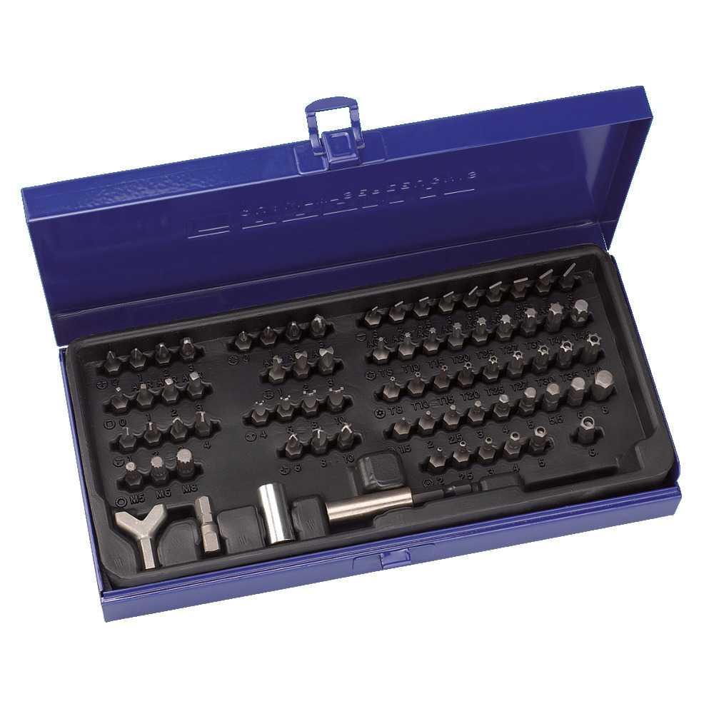 Hochwertiger Bit-Satz für praktisch alle handelsüblichen Schrauben und Sicherheitsschrauben. 75-tlg. In Stahlblechkassette.
