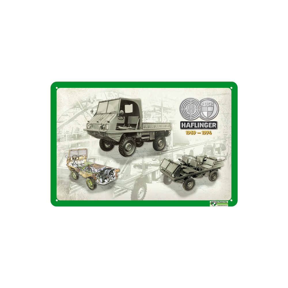 Puch Haflinger 1959 – 1974, wunderschönes Motiv zum 60 jährigen Jubiläum der Geländewagen Legende – Made in Austria. Metallschild mit Motivprägung und 4 Randlochungen zur einfachen Montage. Maße: 30x20cm.