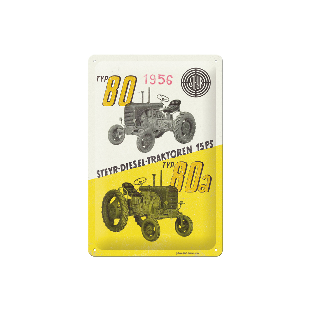 Vorlage dieses Metallschildes war ein Originalprospekt von STEYR für die beiden Modelle Typ 80 und Typ 80a aus 1956. Das Schild wurde im Vintage Style hergestellt und sieht aus, wie wenn es schon viele Jahre alt wäre. Mit 4 Randlochungen zur einfachen Montage. Maße: 30x20cm.