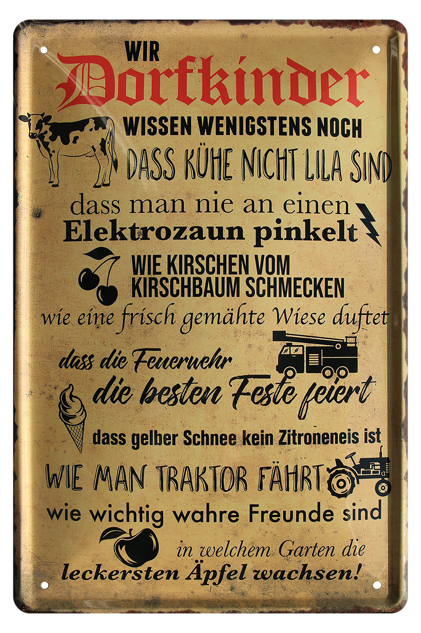 Blechschild in Nostalgie 20x30cm, 4 Randlochungen zur einfachen Montage. Spruch: Wir Dorfkinder wissen wenigstens noch...dass Kühe nicht lila sind..dass man nie an einen Elektrozaun pinkelt...wie reife Kirschen vom Kirschbaum schmecken....wie frisch gemähte Wiesen duften...wie man einen Traktor fährt...dass gelber Schnee kein Zitroneneis ist...
