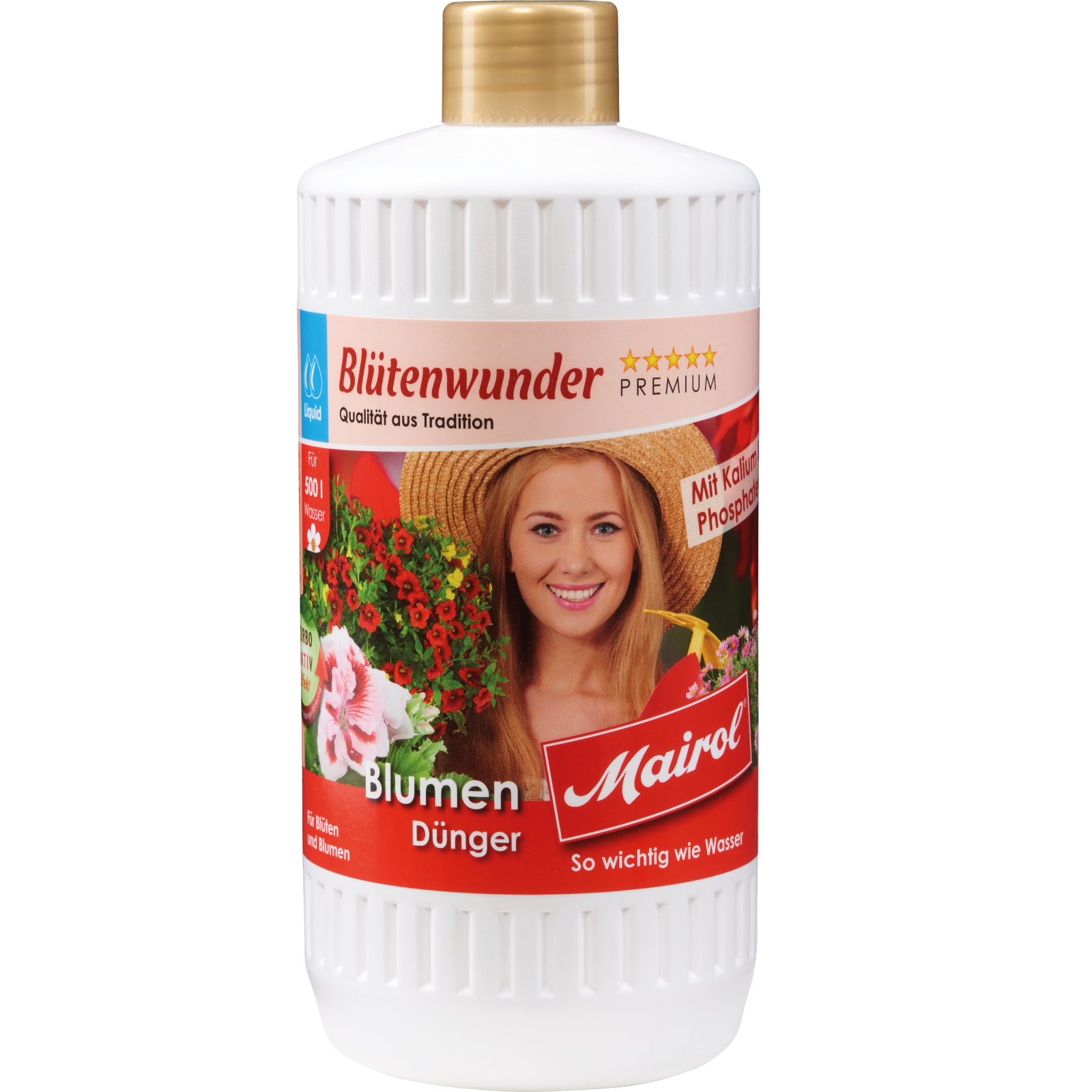 Mineralischer Blumen-Dünger für alle BlühpflanzenNPK-Dünger 4 + 7 + 8Mairol Blütenwunder vitalisiert Blühpflanzen im Haus, auf Balkon und Terrasse sowie im Garten. Es stärkt die Blühwilligkeit, die Fruchtbildung und beschleunigt die Reife. Mit der speziellen Nährstoffzusammensetzung entwickeln die Pflanzen üppige und langanhaltende farbenfrohe Blüten.Mairol Blütenwunder ist ein Spezialdünger, der die Pflanzen kräftigt und für gesundes Wachstum sorgt.Besonders geeignet für: Begonien, Petunien, Chrysanthemen, Geranien, EngelstrompetenAnwendung:2 ml Blumen-Dünger auf 1 Liter Gießwasser20 ml Blumen-Dünger auf 10 Liter GießwasserPflanzen erst ca. vier Wochen nach dem Pflanzen oder Umtopfen düngen.1 l reicht für 500 l GießwasserVor Gebrauch schütteln.Unser Expertentipp: Mairol Wachstumselixier in der Wachstumsphase der Pflanze und danach Wechsel auf Mairol Blütenwunder in der Blühphase.Rezeptur:4% N Gesamtstickstoff [1% Ammoniumstickstoff • 2% Carbamidstickstoff • 1% Nitratstickstoff] • 7% P2O5 wasserlösliches Phosphat • 8% K2O wasserlösliches Kaliumoxyd • 0,02% B wasserlösliches Bor • 0,005% Cu wasserlösliches Kupfer als Chelat von EDTA• 0,11% Fe wasserlösliches Eisen als Chelat von EDTA • 0,02% Mn wasserlösliches Mangan als Chelat von EDTA • 0,001% Mo wasserlösliches Molybdän • 0,002% Zn wasserlösliches Zink als Chelat von EDTAInhaltsstoffe von A bis Z:Stickstoff N:Als Energielieferant jeder Pflanze maßgebend für das Pflanzenwachstum.Phosphor P2O5:Für üppige Blüten- und Farbenpracht, zur Festigung des Gewebes sowie zur Förderung von Wurzelwachstum und Keimung.Kalium K2O:Für die gesamte Festigkeit und somit auch die Kräftigkeit der Pflanze verantwortlich; reguliert den Wasserhaushalt und schützt die Zellen vor Kälte.Mairol Blütenwunder versorgt die Pflanzen mit Stickstoff, Phosphat, Kaliumoxyd und wichtigen Spurenelementen wie Magnesium, Bor, Kupfer, Eisen, Mangan, Molybdän und Zink. Der Mix unserer Nährstoffkomponenten ermöglicht der Pflanze diese unmittelbar aufzunehmen.Notwendige Pflanzennährstoffe, die nur in sehr geringen Mengen von den Pflanzen benötigt werden, sind teilweise sehr wichtig für die Pflanzen.Magnesiumoxyd MgO als wichtiger Bestandteil des Chlorophylls unentbehrlich für die Blattgrünbildung.Bor verhütet bei Pflanzen die TrockenfäuleEisen fördert den Zellstoffwechsel und sorgt für sattes BlattgrünMangan verhindert die DörrfleckenkrankheitMolybdän wird vor allem bei Gemüse benötigtNickel und Vanadium verbessern die Aufnahmefähigkeit und Wirkungskraft anderer Nährstoffe erheblich.Zink bewirkt schon in geringsten Mengen die Heilung und das Wohlergehen der PflanzeEDTA-Chelatkomplexe:Sehr wichtig für die Verwertung der Spurenelemente. Chelatbildner sind organische Moleküle, die Metallionen binden und die Löslichkeit der Spurennährstoffe erhöhen.Eisen, Kupfer, Mangan und Zink sind in Mairol-Flüssigdüngern chelatisiert und stehen der Pflanze bis in die Pflanzenzellen bereits nach sehr kurzer Zeit zur Verfügung.Sicherheitshinweise:PräventionP261 Einatmen von Staub / Rauch / Gas / Nebel / Dampf / Aerosol vermeiden.P262 Nicht in die Augen, auf die Haut oder auf die Kleidung gelangen lassen.