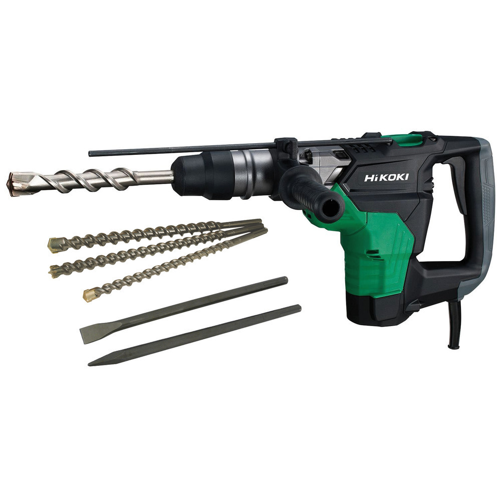 Leistungsstarker SDS Bohrhammer mit 1.100 Watt Motor. Bohrleistung bis 40 mm in Beton bzw. 8,5 Joule Schlagleistung. Staubgeschützte Einhand SDS-max Aufnahme und Sicherheitsrutschkupplung. Schnellste Bohrgeschwindigkeit und höchste Abbruchleistung seiner Klasse mit 2 Funktionen: Hammerbohren, Meißeln. Mit Drehstopp für Meißelarbeiten und 12 verschiedene Meißelpositionen einstellbar. Staubgeschützter, großflächiger 2-Finger Ein-/Ausschalter und 360° rundum verstellbarer Zusatzhandgriff mit Abschaltkohlebürsten.