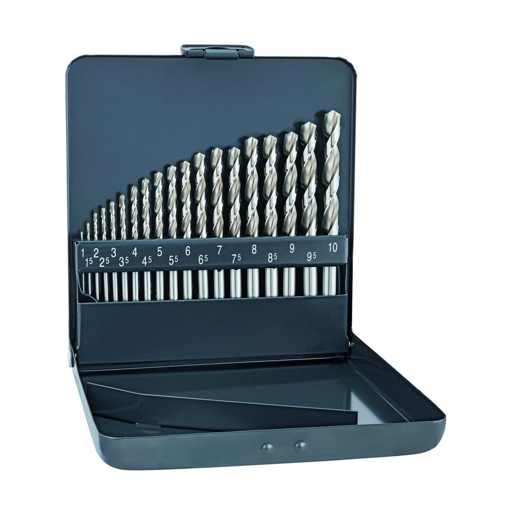 Hochwertiger HSS-Bohrersatz für den universellen Einsatz in legiertem und unlegiertem Stahl. Größen 1,0 - 10,0 mm in 0,5 mm Steigung.