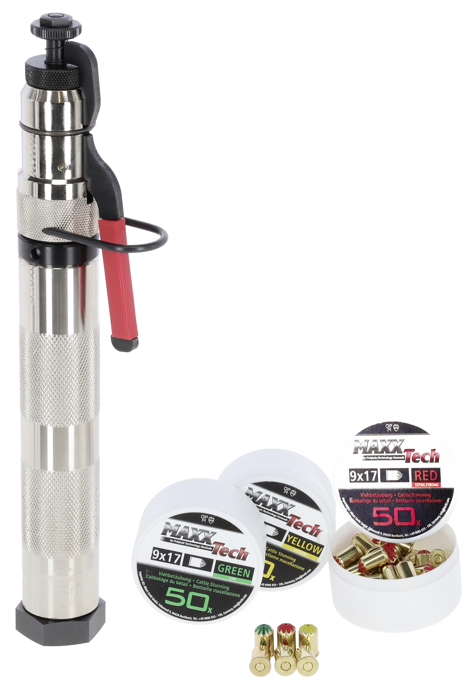 Hochwertiger, vernickelter Viehschussapparat zur Betäubung von Schlachtvieh wie Schweinen, Schafen, Kälber, Kühe, Bullen, Ochsen und Pferde. Das spezielle Sicherheitssystem ermöglicht ausschließlich die Verwendung mit zugelassenen Patronen des Kalibers 9 x 17 mm. Schutzbügel über dem Auslösehebel. Austrittslänge Schussbolzen ca. 82 mm. Bolzengeschwindigkeit je nach gewählter Kartusche 42 bis 49 m/s. Lieferung inkl. Bedienungsanleitung und Reinigungsbürste mit 2 verschiedenen Bürstenköpfen. Gewicht ca. 2,2 kg.