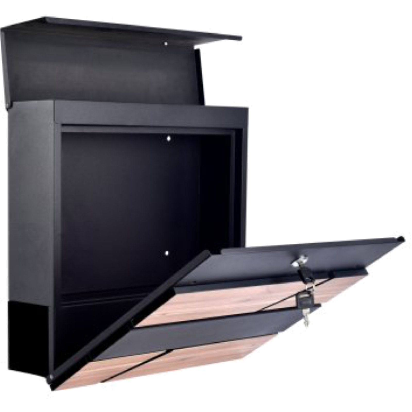 Dieser stilvolle Briefkasten aus Stahl vereint modernes Design mit rustikalem Charme und ist die perfekte Ergänzung für Ihren Eingangsbereich.Das robuste Metallgehäuse in Schwarz wird elegant durch eine Holzoptik-Applikation ergänzt, die für eine warme und einladende Ausstrahlung sorgt.Mit seinen Maßen von ca. 37 x 37 x 11 cm bietet er ausreichend Platz für Ihre Post. Das praktische Zeitungsfach an der Unterseite sorgt dafür, dass Zeitungen und Prospekte nicht in den Hauptbriefkasten gestopft werden müssen und stets griffbereit sind.Für Ihre Sicherheit kommen die passenden 2 Schlüssel gleich mit.Das gesamte Montagematerial ist ebenfalls im Lieferumfang enthalten, sodass die Anbringung schnell und unkompliziert ist.