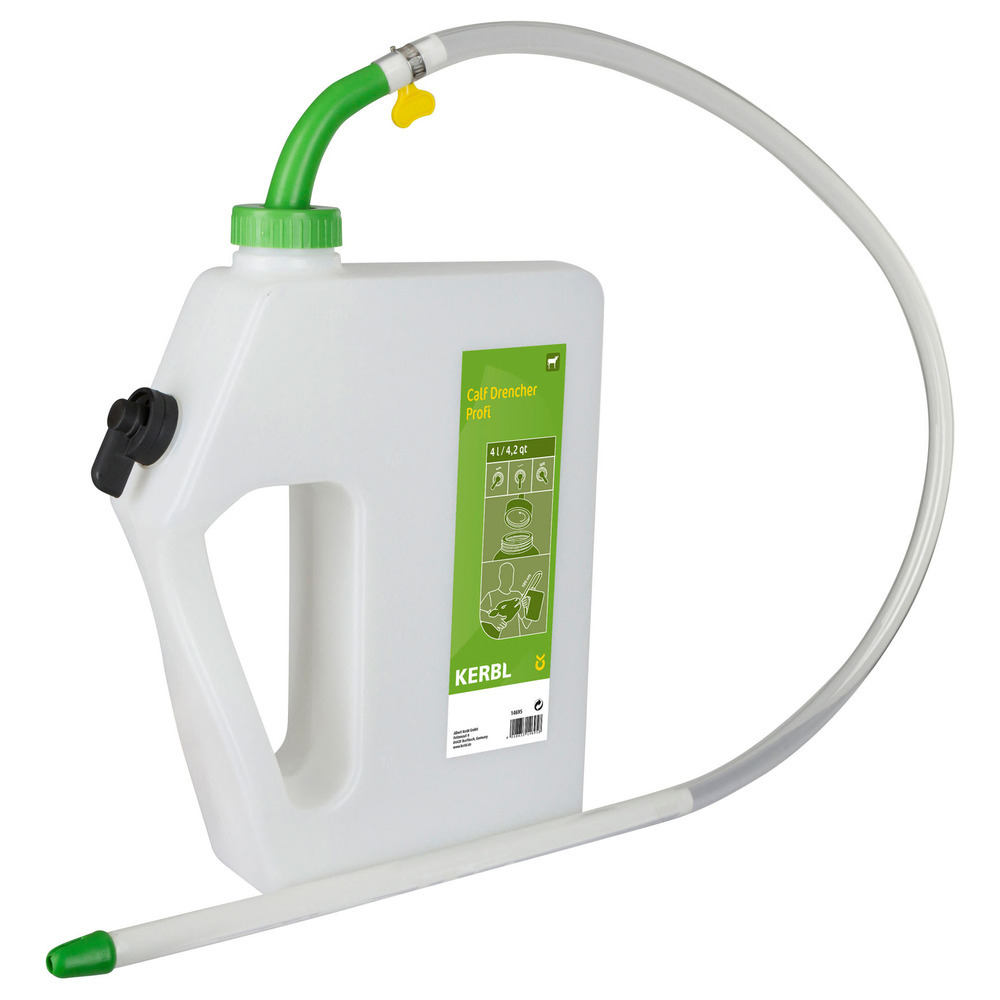 Unverzichtbar für jeden Kälberhalter! Drencher-Flasche (4 Liter) zur Flüssigkeitstherapie und elektrolytischen Behandlung von Kälbern.Inklusive flexibler Sonde (Länge 105 cm). Flasche mit Schraubverschluss und Füllskala. Aus lebensmittelechtem Kunststoff. Mit 3-Stufen-Ventil zur Einstellung der Tränkegeschwindigkeit!