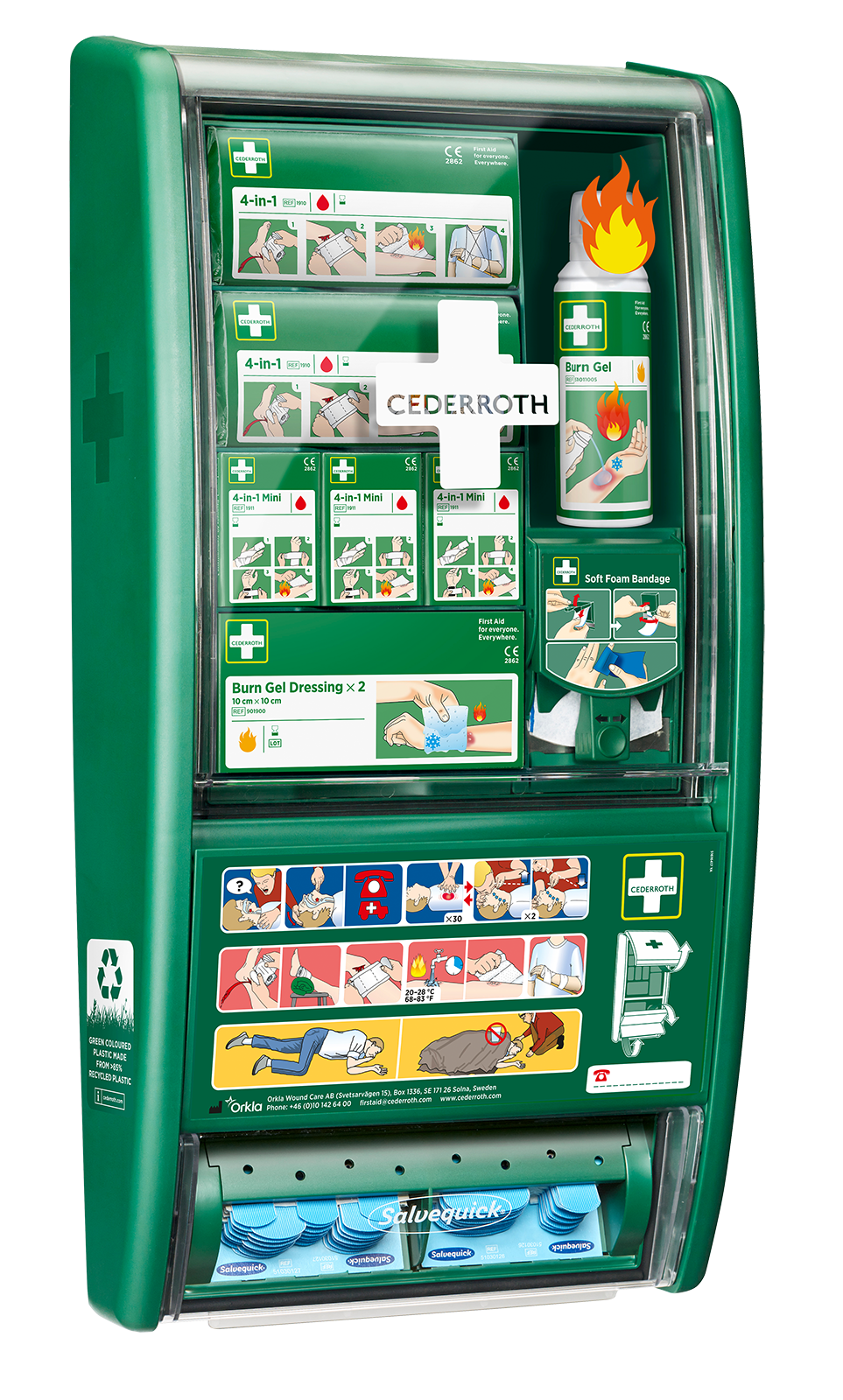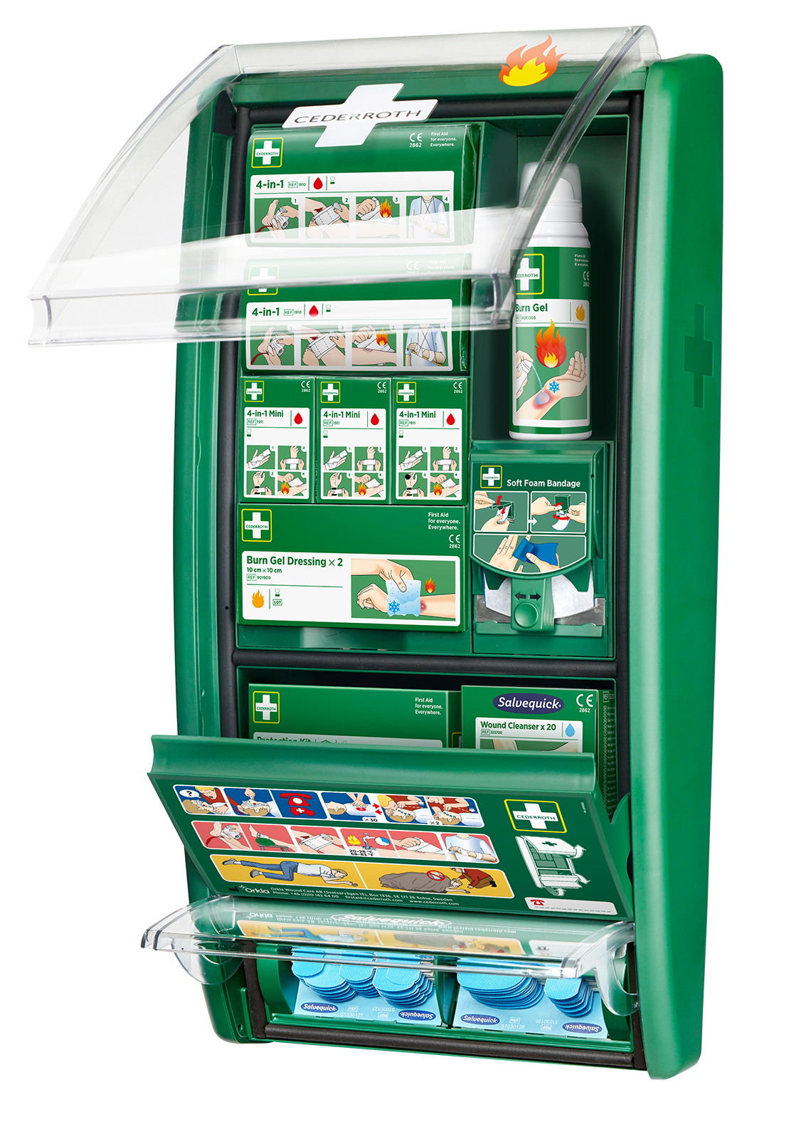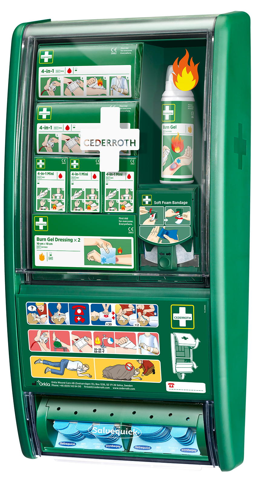 Die Erste-Hilfe-Station mit Zusatzausrüstung für Verbrennungen.Eine Erste-Hilfe-Station für alle Berufe mit hohem Risiko von Verbrennungen und Schnittverletzungen, z. B. Köche, Elektriker und Schweißer.Mit der richtigen Ausrüstung in Reichweite kann bei Unfällen schneller und wirksamer Erste Hilfe geleistet werden.Burn Cover Pflaster, das kleinere Brandwunden schützt und den Schmerz lindert.Die Wundauflage besteht aus einem kühlen Hydrogel, das die Nervenstränge der Haut abdeckt.Auf diese Weise werden der Schmerz gelindert und die Wundheilung beschleunigt. Die Wundauflage haftet nicht an der Wunde.Cederroth Burn Gel Spray und sterile Kompressen sorgen für schnelle Kühlung sowie effektive Schmerzlinderung bei Brandwunden und beschleunigen den Heilungsprozess.Die Cederroth Burn Gel Produkte sind genauso wirksam wie lauwarmes Wasser.Soft Foam Bandage Blue ist ein elastisches, selbstklebendes Pflaster, das maximale Beweglichkeit gewährt.Mit dem intelligenten Spender lassen sich Streifen einfach und passgenau abschneiden.Das Pflaster ist für alle Arten von Wunden geeignet und löst sich nicht im Wasser.Salvequick Blue Detectable Pflaster sind ideal für den Lebensmittelbereich.Die blaue Farbe sorgt für gute Sichtbarkeit. Das Pflaster wird von den meisten Metalldetektoren erkannt.Abmessungen: 29 x 56 x 12 cm (BxHxT)Ideal zum Einsatz in der Gastronomie und DirektvermarktungInhalt2 Cederroth 4-in-1 Blutstiller3 Cederroth 4-in-1 Mini-Blutstiller2 (x 2) Cederroth Burn Gel Dressing1 Cederroth Burn Gel 100 ml1 Cederroth Soft Foam Spender inkl. Soft Foam Bandage Blue 2 m x 6 cm1 Salvequick Pflasterspender inkl. 2 (x 5) Salvequick blaue detektierbare Pflaster1 (x 30) Blue Detectable Pflaster Normal/Fingerkuppen1 (x 10) Verpackung Burn Cover mit Hydrogelpflaster1 (x 20) Salvequick Wundreiniger1 Beatmungsmaske1 Erste Hilfe-Anleitung1 Spezialschlüssel1 Bohrvorlage