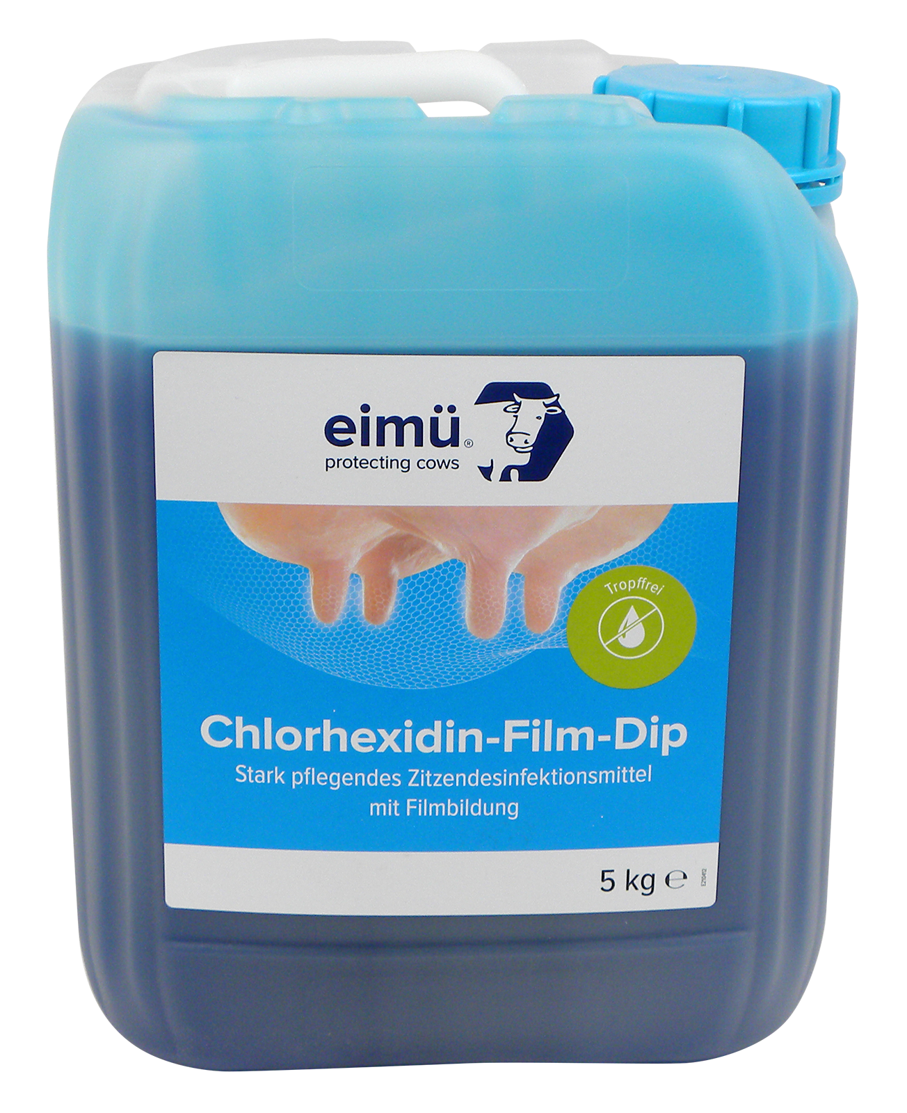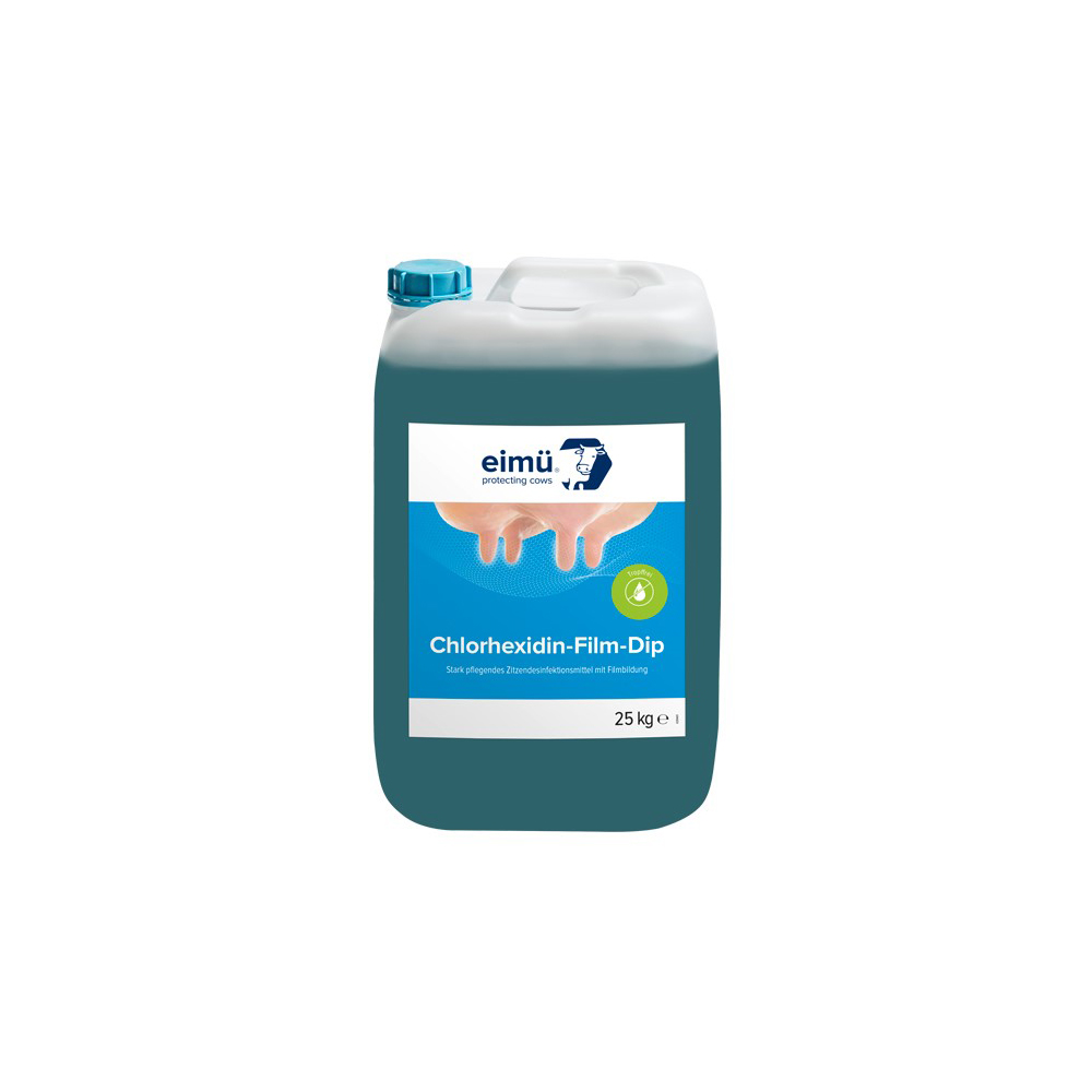 Dieses Produkt ist ein hoch wirksames und sicheres Desinfektionsmittel auf der Basis von 5.000 ppm Chlorhexidindigluconat. Der Einsatz von bewährten Pflegestoffen in eimü® Chlorhexidin-Film-Dip hält die Zitzenhaut gesund und geschmeidig. Auch erleichtern die blaue Markierung und die hervorragende Filmbildung die Anwendung.