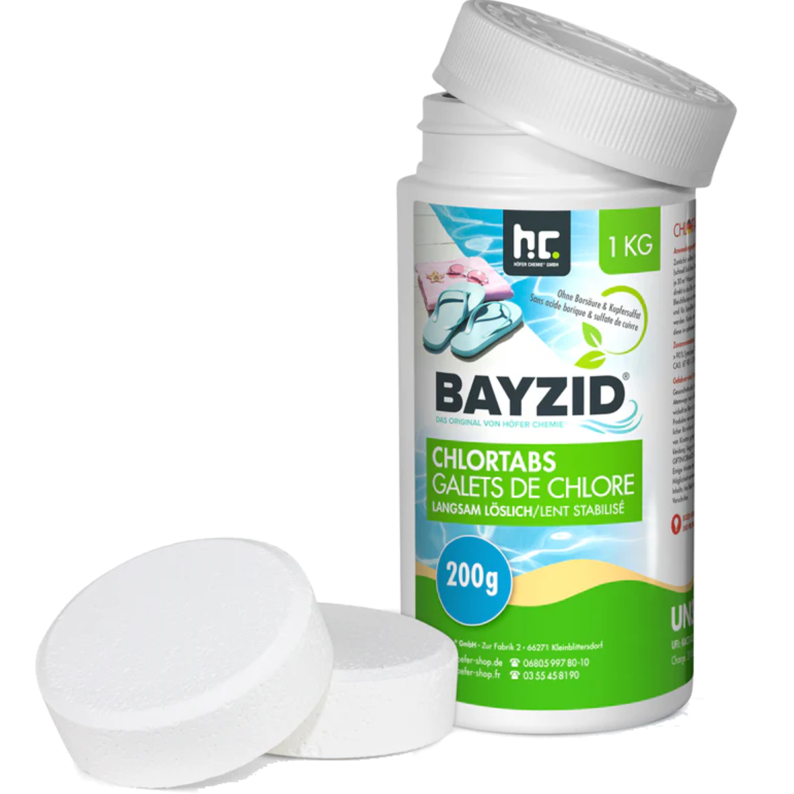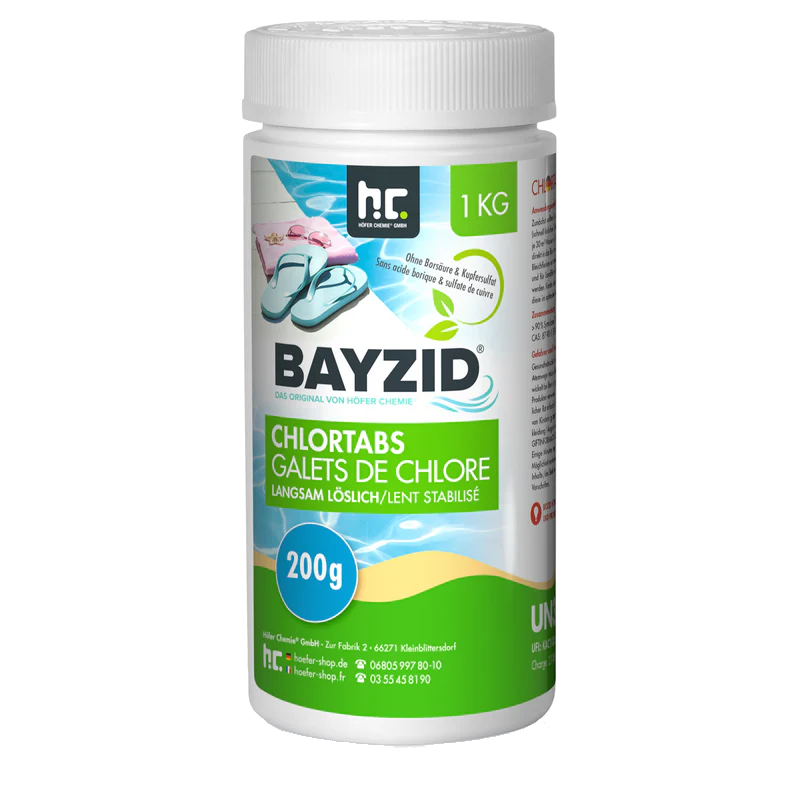 200g Chlortabletten – für sauberes Pool- und SchwimmbadwasserDiese leistungsstarken Chlortabletten sind ideal für alle Poolbesitzer, die Wert auf dauerhaft hygienisch sauberes Wasser legen.Mit einem hohen Wirkstoffgehalt von mindestens 90 % aktivem Chlor sorgen sie zuverlässig für eine stabile Desinfektion.Die Tabletten sind organisch, kalkfrei und speziell für den langfristigen Einsatz im Schwimmbecken entwickelt – für eine effektive Wasserpflege auf hohem Niveau.Wofür werden diese Tabletten verwendet?Langsam lösliche Chlortabletten werden zur langfristigen Bekämpfung von Keimen und zur Anhebung des Chlorgehalts eingesetzt.Dabei muss vorher der optimale Chlorwert mithilfe eines schnell löslichen Chlors wie z.B. Chlorgranulat oder Chlor flüssig eingestellt werden.Dosierungsempfehlung:Diese Tabletten sind erst ab einer Füllmenge von 30m³ geeignet. Geben Sie 1 Tablette alle 5-8 Tage in das vorgesehene Behältnis, z.B. einem Schwimmmdosierer ein. Sie sollten die Tablette nicht direkt in das Becken werfen und auch nicht in den Skimmer legen, da bei einigen Pools Bleichflecken entstehen können. Zusätzlich besteht bei einer Nichtfunktion der Filtration die Gefahr, dass die Chlorkonzentration im Skimmerbereich so hoch wird, dass dieser inklusive der Folie (falls vorhanden) angegriffen werden kann.Sollten sich die Tabletten schneller auflösen, kann dies mit hoher Badefrequenz oder mit hohen Temperaturen zusammenhängen.Optimaler Chlorwert: 0,6 - 1,5 mg/l (Je nach Technik, Besucherzahl und Temperatur, bis zu 2 mg/l. Bei Verwendung von Kartuschenfiltern bis zu 3,0 mg/l).Zulassung von Kupfersulfat-Pentahydrat (ist nicht identisch mit Kupfersulfat!) als Wirkstoff zur Verwendung in BiozidproduktenCLP-/REACH-HinweiseSignalwort: Achtung ! H302: Gesundheitsschädlich bei Verschlucken. H319: Verursacht schwere Augenreizung.H335: Kann die Atemwege reizen. H410: Sehr giftig für Wasserorganismen mit langfristiger Wirkung.Biozidprodukte vorsichtig verwenden. Vor Gebrauch stets Etikett und Produktinformationen lesen.Weitere Informationen:Biozid Registrierungsnummer: N-63986Gefahrenklasse: 4.1: WassergefährdendKindersicherheitsverschluss: NeinLagerung: Frostgeschützt, im Original Gebinde, kühl und trocken lagernHaltbarkeit: 3 - 4 Jahre nach Kaufdatum