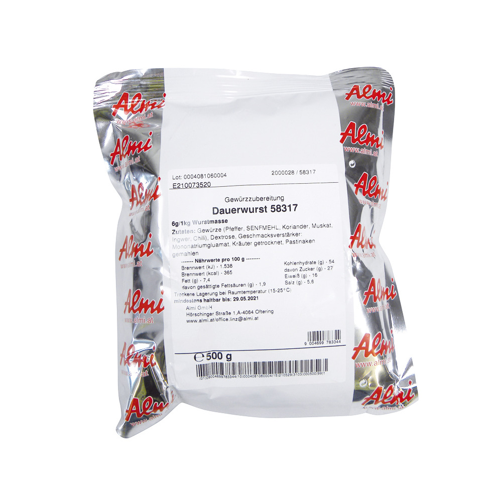 Qualität von höchster Güte, aromageschützt verpackt. Hochwertige Rohstoffe sind die Basis für erstklassige Produktqualität.0,5 kg, 6 g/kg Wurstmasse.
