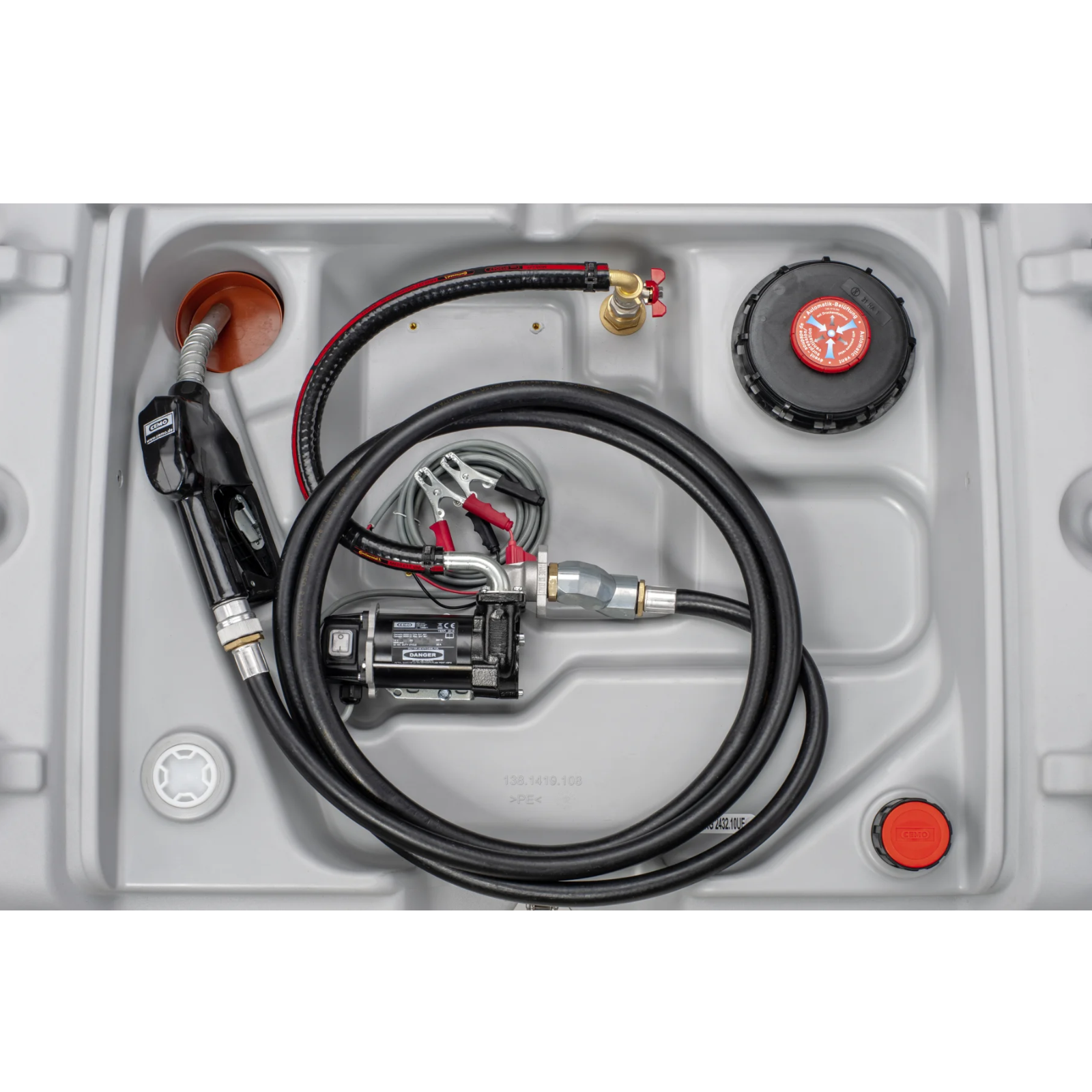 Füllstutzen, Zapfpistolenhalter, und Belüftung mit Druckentlastung integriert.Lieferung komplett montiert inkl. Pumpe 40 L/min 12 Volt, Auslaufschlauch 3/4 Zoll 4 m Länge und automatischer Zapfpistole.