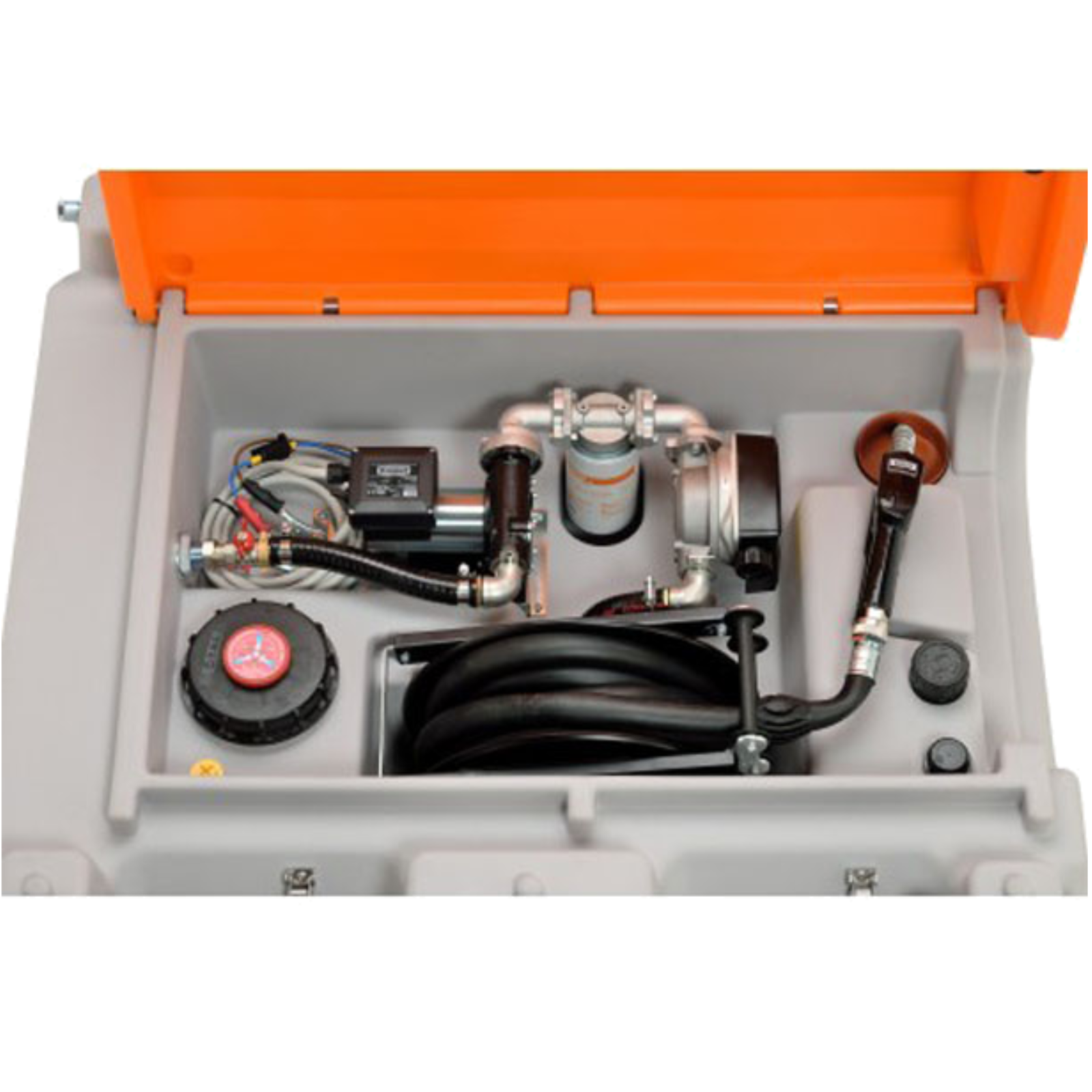 Behälter aus hochwertigem Polyetylen mit Integrierter Schwallwand.Optimale Form mit integrierter Stapeltasche und Kranösen für einfachen Transport und einfaches Verladen.Klappdeckel als Schutz für Pumpe und Schlauch.Premium - Ausführung komplett mit 8 m Auslaufschlauch auf integriertem Schlauchaufroller, Zählwerk, Wasserabscheider und automatischer Zapfpistole.Pumpe 12/24 Volt 35/70 L/min Förderleistung.