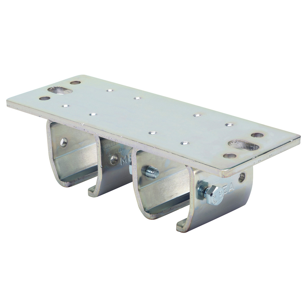 Zum Befestigen parallel laufender Schienen direkt an der Decke, beispielsweise bei Türstöcken, Trägern, etc. Verzinkte Ausführung, mit Flanschplatte und 6-Loch Individual Befestigungs-Möglichkeit.BG2 mit Abstand 90 mm (Laufrohr Mitte-Mitte), Flanschplatte 222x80 mm