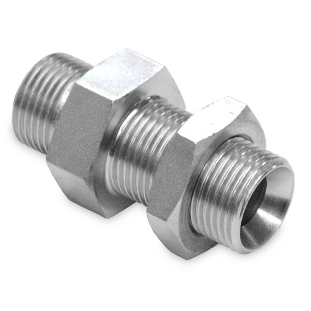 Gerader Schottadapter mit zölligem Außengewinde und 60° Innenkonus.Die Adapter mit einseitig langem Gewinde(Schottgewinde) werden zur Durchführung und Befestigung von Hydraulikleitungen an Blechteilen, Rahmenteilen usw. verwendet. Mit der Gegenmutter auf dem langen Gewinde werden die Schottadapter befestigt.