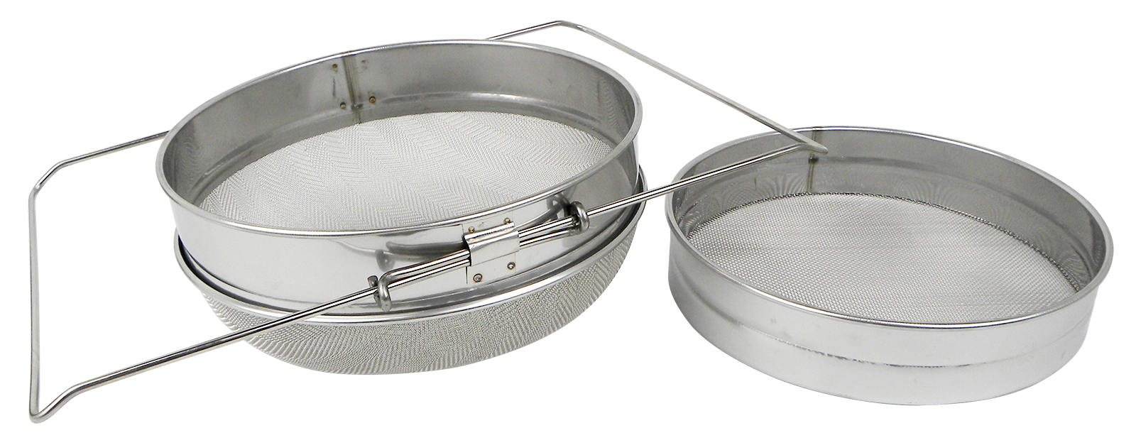 Doppelsieb komplett aus Edelstahl. Durch das bis zu 40cm ausziehbare, verstellbare Gestell ist es mit vielen Honigtöpfen kombinierbar. Es besteht aus zwei Sieben, von denen das gröbere eine Maschenweite von 1mm und das feinere eine Maschenweite von 0,7mm besitzt. Somit können sowohl größere als auch kleinere Wachspartikel oder sonstige Verunreinigungen herausgefiltert werden. Gestell ausziehbar auf 40cm