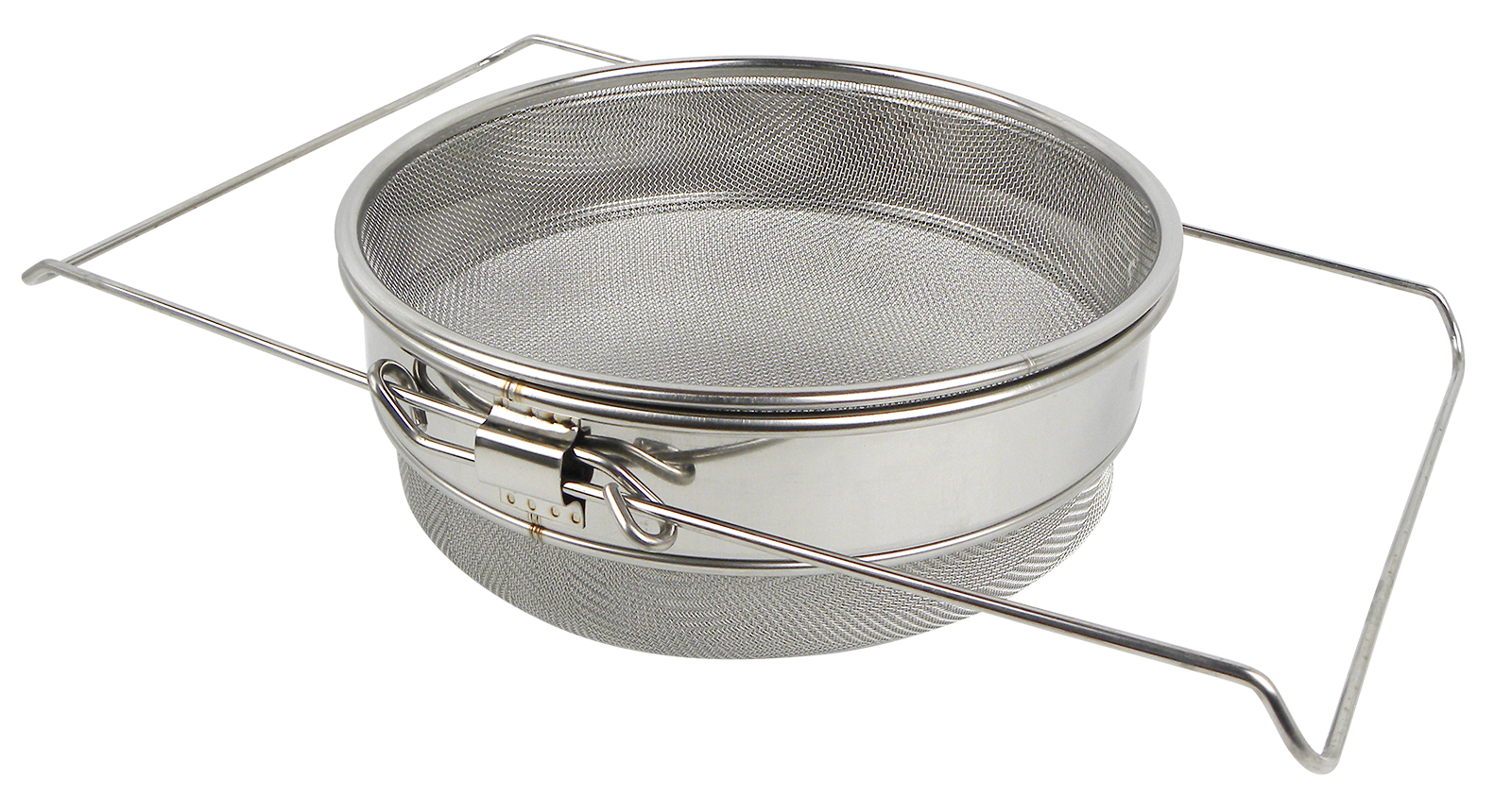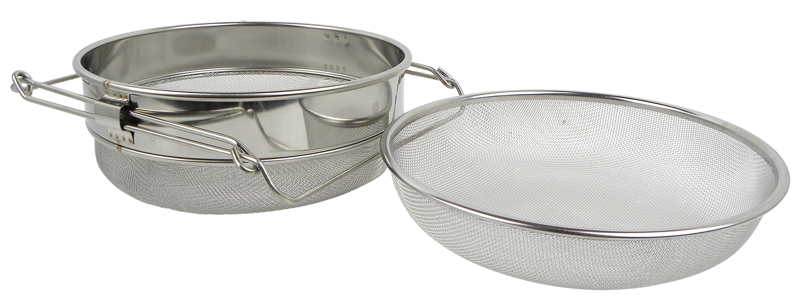 Doppelsieb komplett aus Edelstahl. Durch das bis zu 40cm ausziehbare, verstellbare Gestell ist es mit vielen Honigtöpfen kombinierbar.Es besteht aus zwei Sieben, von denen das gröbere eine Maschenweite von 1mm und das feinere eine Maschenweite von 0,7mm besitzt.Somit können sowohl größere als auch kleinere Wachspartikel oder sonstige Verunreinigungen herausgefiltert werden.Grobsieb mit Gitter bis zum Haltering ausgeführt!