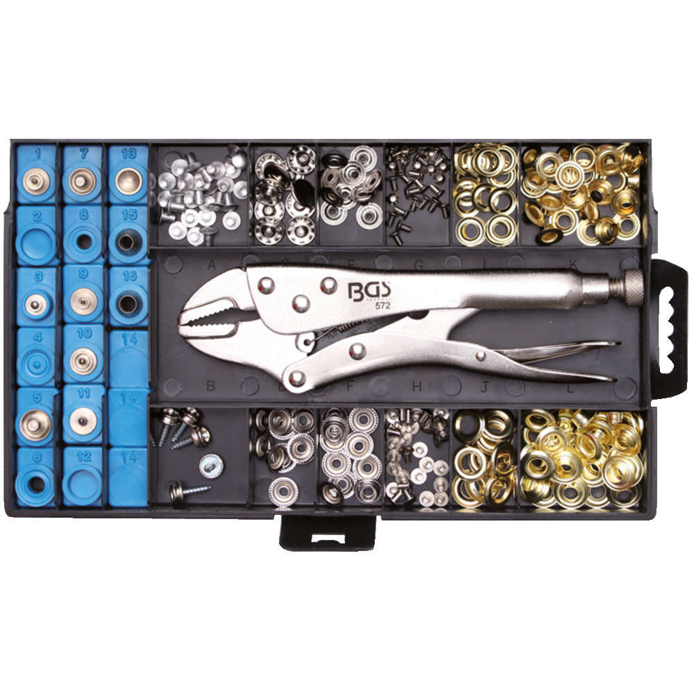 Gripösenzange18 Öseneindruckvorrichtungen (auswechselbar)Ösen verschiedener Größen10 mm Druckknöpfe zum Nieten und VerschraubenDie Lieferung erfolgt in einer praktischen Kunststoff – Sichtkassette.