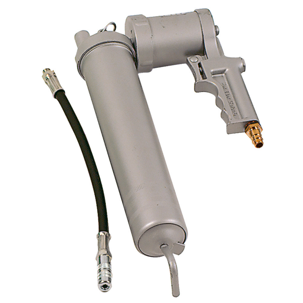 Mit Entlüftungsventil und Füllnippel für Fettfüllgerät. Druckübersetzung 1:50 - empfohlener Arbeitsdruck 6 bar. Fassungsvermögen 500 ccm, zur Füllung mit Kartuschen, losem Fett und durch Füllgeräte. Komplett mit Düsenrohr und Hy-Mundstück.