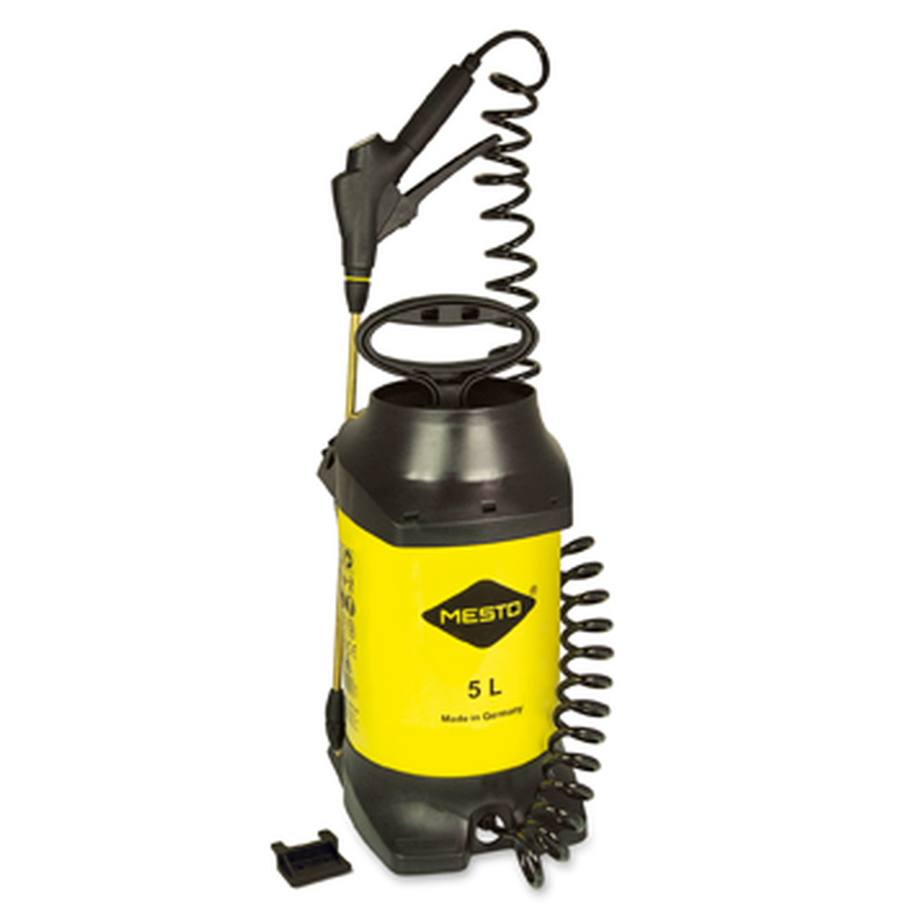 Hochwertiger Drucksprüher mit 5 Liter Füllinhalt mit Düse, Spritzrohr 40 cm und Spiralschlauch mit 2,5 m Länge. Betriebsdruck: 3 bar. Kolbenmanometer mit eingebautem Sicherheitsventil, integrierter Einfülltrichter und Fußreif für sicheren Stand und einem Wandhalter.